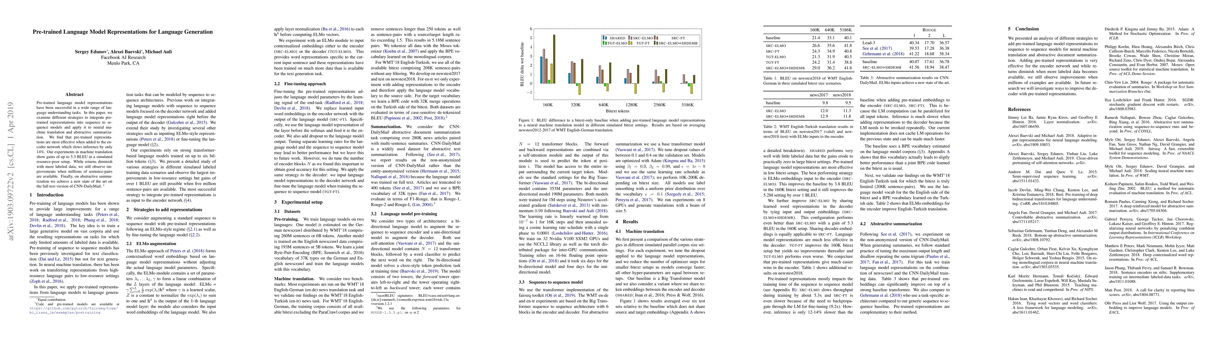 This paper explores integrating pre-trained language model representations into sequence-to-sequence models for neural machine translation and abstractive summarization, finding that adding them to the encoder network yields the best results with minimal inference slowdown. The study reports significant improvements in translation quality and achieves a new state-of-the-art in summarization.