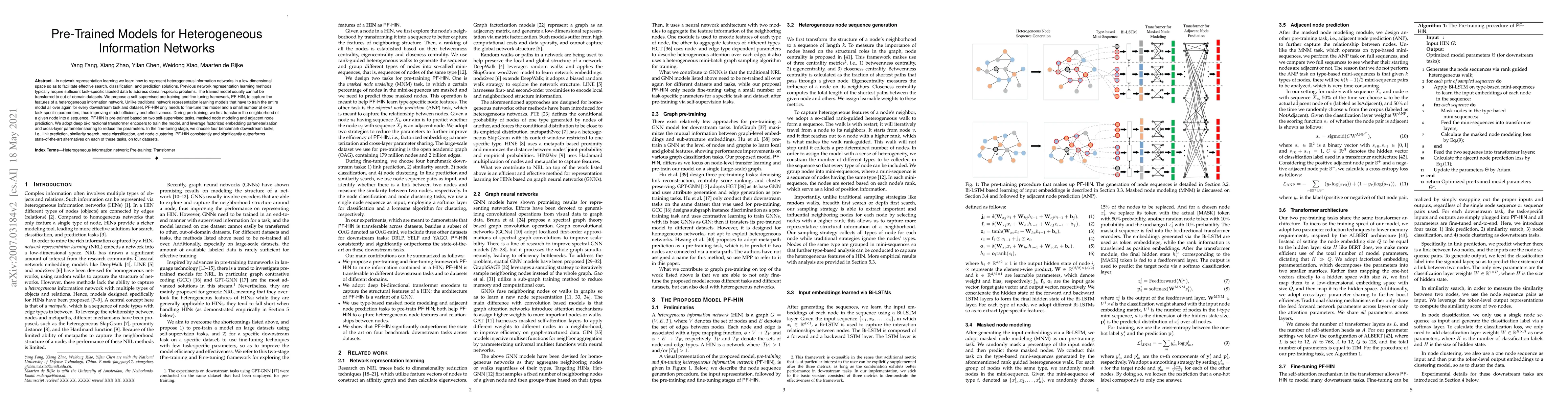 The paper proposes PF-HIN, a self-supervised pre-training and fine-tuning framework for learning representations of heterogeneous information networks, enabling efficient transfer learning across different tasks and datasets. PF-HIN outperforms existing methods on benchmark tasks like link prediction and node classification.