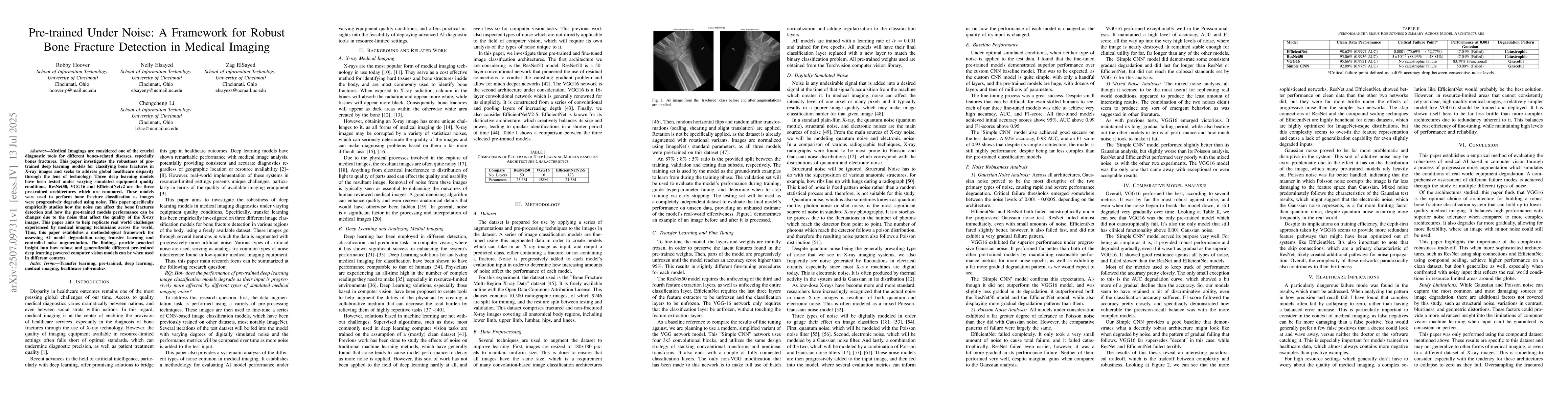 Medical Imagings are considered one of the crucial diagnostic tools for different bones-related diseases, especially bones fractures. This paper investigates the robustness of pre-trained deep learning models for classifying bone fractures in X-ray images and seeks to address global healthcare disparity through the lens of technology. Three deep learning models have been tested under varying simulated equipment quality conditions. ResNet50, VGG16 and EfficientNetv2 are the three pre-trained architectures which are compared. These models were used to perform bone fracture classification as images were progressively degraded using noise. This paper specifically empirically studies how the noise can affect the bone fractures detection and how the pre-trained models performance can be changes due to the noise that affect the quality of the X-ray images. This paper aims to help replicate real world challenges experienced by medical imaging technicians across the world. Thus, this paper establishes a methodological framework for assessing AI model degradation using transfer learning and controlled noise augmentation. The findings provide practical insight into how robust and generalizable different pre-trained deep learning powered computer vision models can be when used in different contexts.