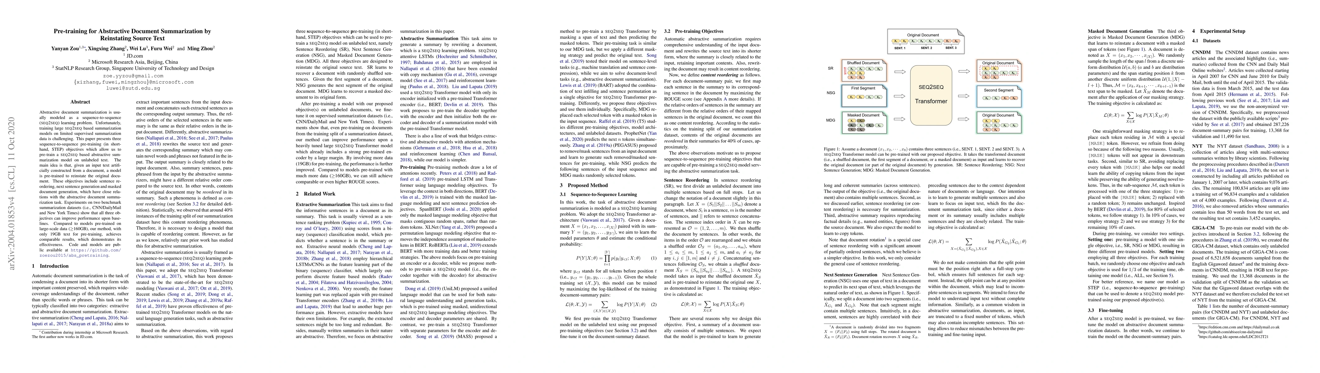 This paper proposes three pre-training objectives—sentence reordering, next sentence generation, and masked document generation—to pre-train a Seq2Seq model for abstractive summarization on unlabeled text. Experiments show that these methods improve summarization performance and achieve comparable results to models pre-trained on much larger datasets.