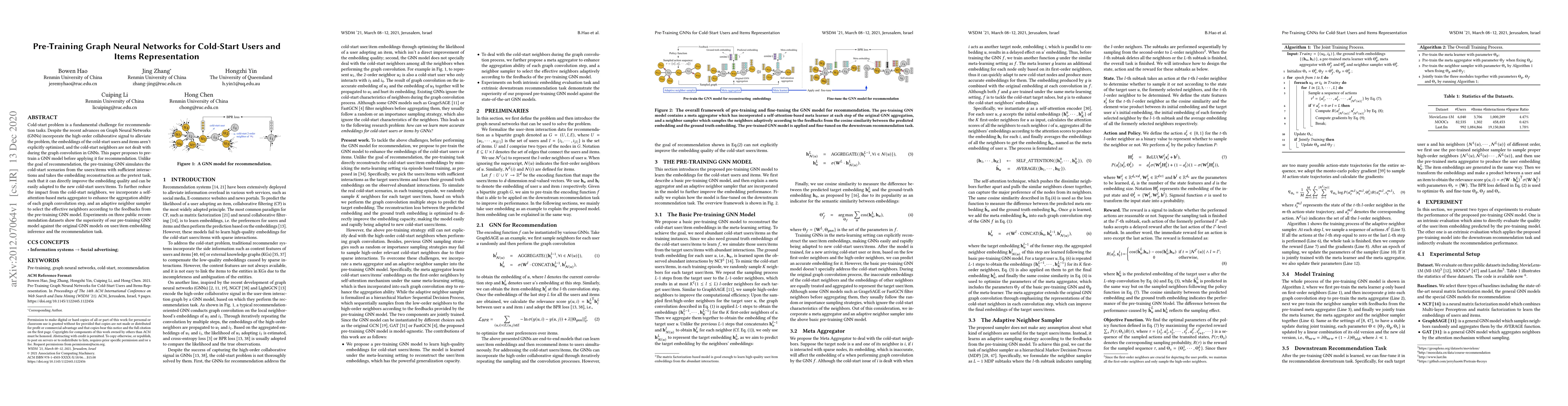 This paper proposes a pre-training method for Graph Neural Networks (GNNs) to tackle the cold-start problem in recommendation systems, enhancing embeddings for new users and items through a reconstruction pretext task. It employs a self-attention-based meta aggregator and adaptive neighbor sampler to improve performance, demonstrating superior results on public datasets.