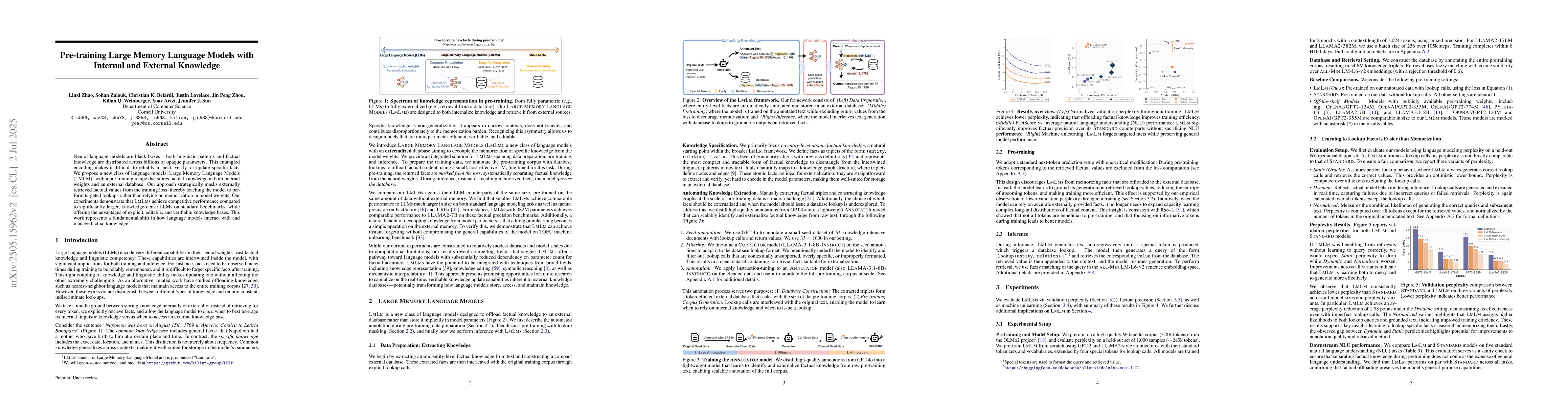 Neural language models are black-boxes -- both linguistic patterns and factual knowledge are distributed across billions of opaque parameters. This entangled encoding makes it difficult to reliably inspect, verify, or update specific facts. We propose a new class of language models, Large Memory Language Models (LMLM) with a pre-training recipe that stores factual knowledge in both internal weights and an external database. Our approach strategically masks externally retrieved factual values from the training loss, thereby teaching the model to perform targeted lookups rather than relying on memorization in model weights. Our experiments demonstrate that LMLMs achieve competitive performance compared to significantly larger, knowledge-dense LLMs on standard benchmarks, while offering the advantages of explicit, editable, and verifiable knowledge bases. This work represents a fundamental shift in how language models interact with and manage factual knowledge.