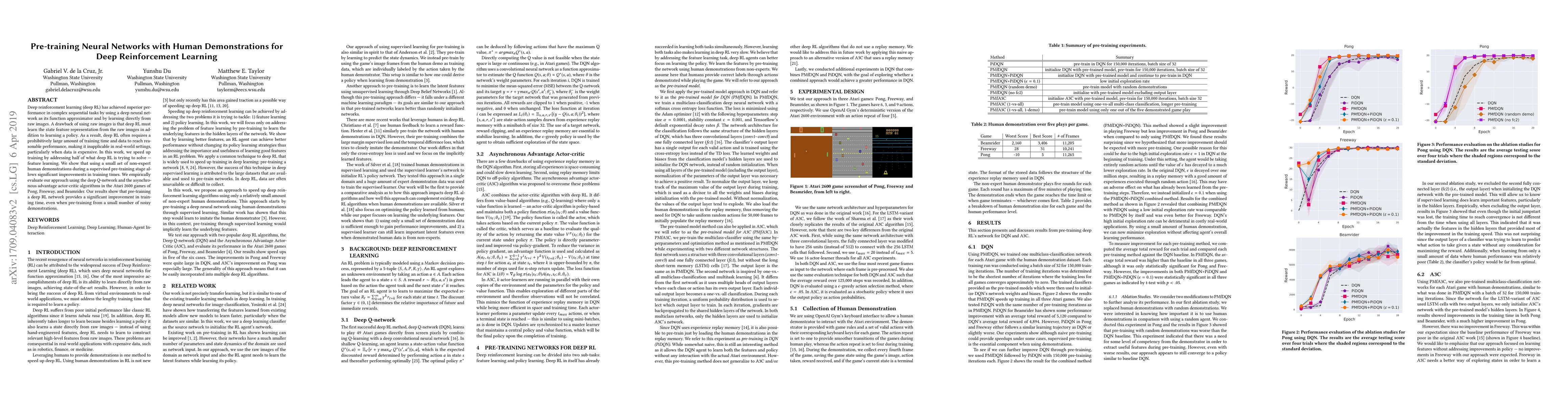 This paper proposes pre-training neural networks for deep reinforcement learning (deep RL) using human demonstrations to speed up training. The approach leverages supervised learning with a small set of human demonstrations to learn important features, significantly reducing training time and data requirements compared to traditional deep RL methods.