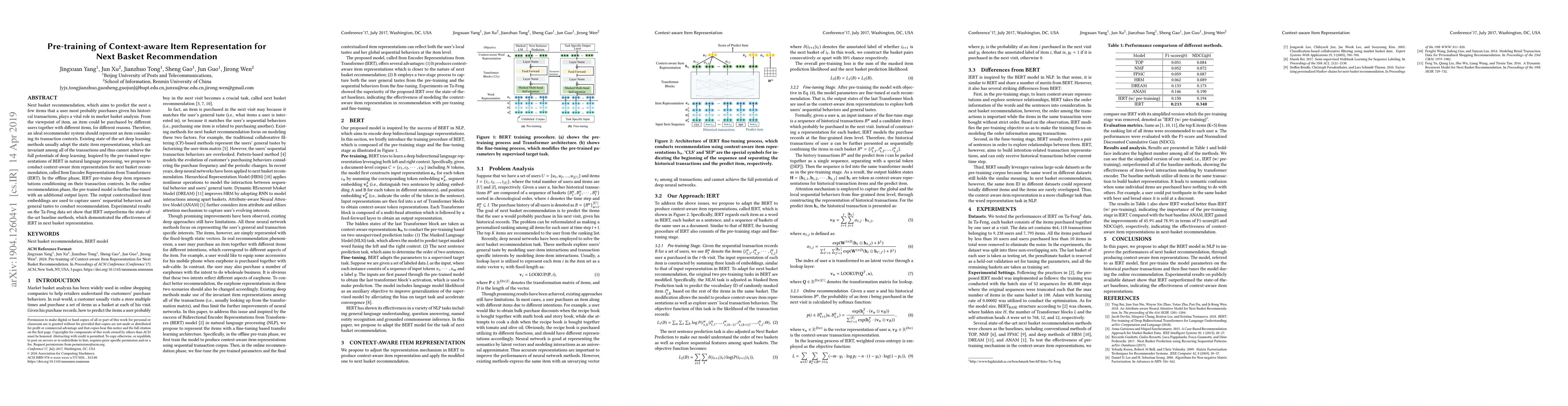 This paper proposes a method called Item Encoder Representations from Transformers (IERT) to pre-train context-aware item representations for next basket recommendation, outperforming existing static representation methods. The IERT model pre-trains deep item embeddings based on transaction contexts and fine-tunes them for online recommendation, achieving better results on the Ta-Feng dataset.