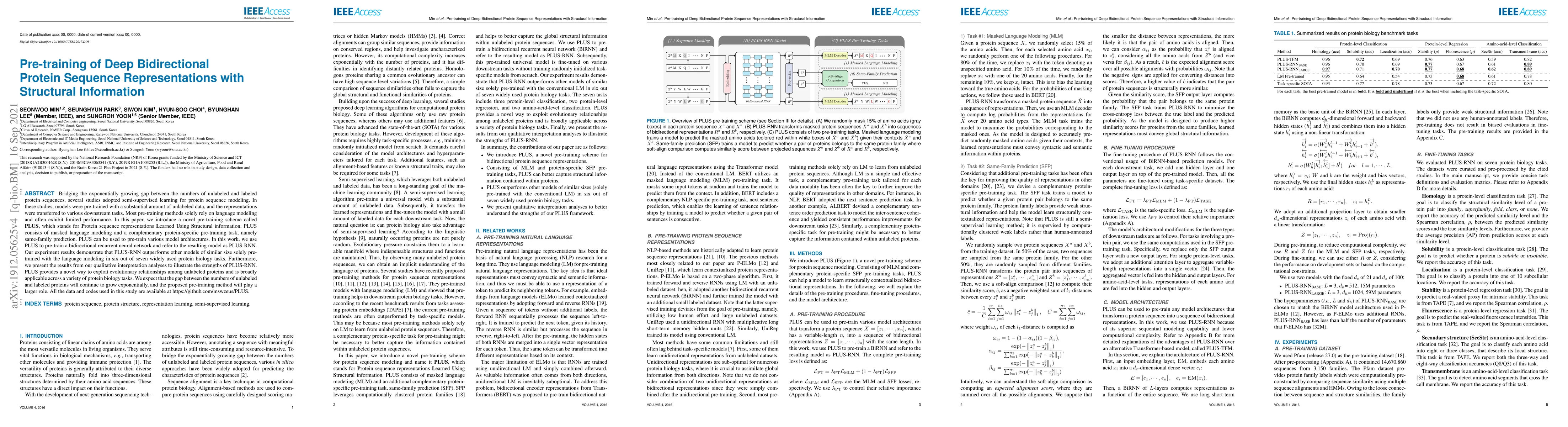 This paper introduces PLUS, a novel pre-training method for deep bidirectional protein sequence representations that leverages structural information, outperforming traditional language modeling-based methods in protein biology tasks. PLUS-RNN, pre-trained using PLUS, shows superior performance across multiple protein tasks, demonstrating the effectiveness of incorporating structural data in pre-training.
