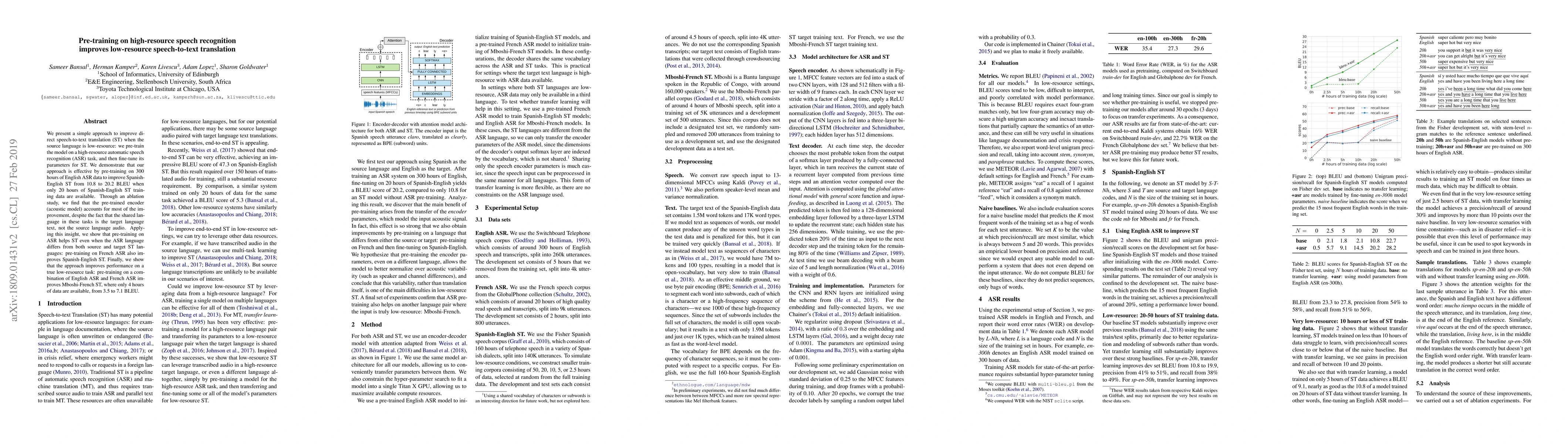 We present a simple approach to improve direct speech-to-text translation (ST) when the source language is low-resource: we pre-train the model on a high-resource automatic speech recognition (ASR) task, and then fine-tune its parameters for ST. We demonstrate that our approach is effective by pre-training on 300 hours of English ASR data to improve Spanish-English ST from 10.8 to 20.2 BLEU when only 20 hours of Spanish-English ST training data are available. Through an ablation study, we find that the pre-trained encoder (acoustic model) accounts for most of the improvement, despite the fact that the shared language in these tasks is the target language text, not the source language audio. Applying this insight, we show that pre-training on ASR helps ST even when the ASR language differs from both source and target ST languages: pre-training on French ASR also improves Spanish-English ST. Finally, we show that the approach improves performance on a true low-resource task: pre-training on a combination of English ASR and French ASR improves Mboshi-French ST, where only 4 hours of data are available, from 3.5 to 7.1 BLEU.