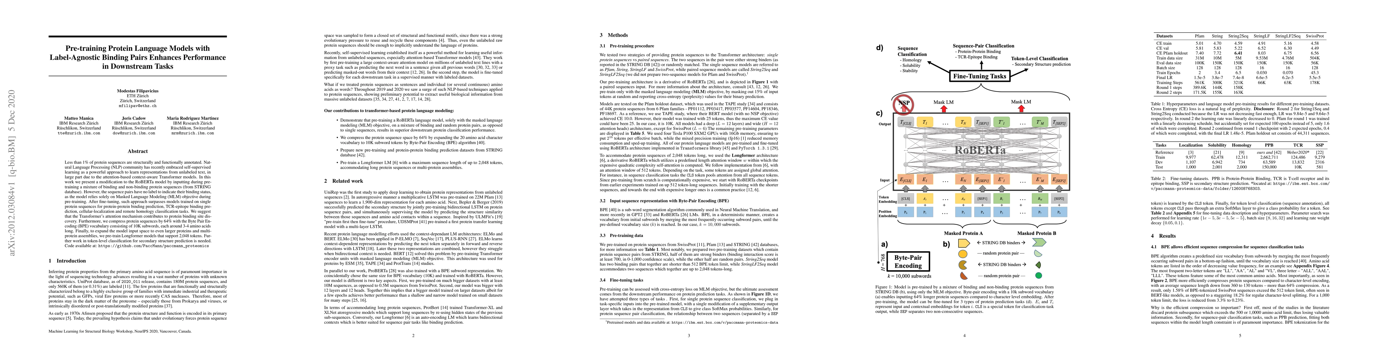Less than 1% of protein sequences are structurally and functionally annotated. Natural Language Processing (NLP) community has recently embraced self-supervised learning as a powerful approach to learn representations from unlabeled text, in large part due to the attention-based context-aware Transformer models. In this work we present a modification to the RoBERTa model by inputting during pre-training a mixture of binding and non-binding protein sequences (from STRING database). However, the sequence pairs have no label to indicate their binding status, as the model relies solely on Masked Language Modeling (MLM) objective during pre-training. After fine-tuning, such approach surpasses models trained on single protein sequences for protein-protein binding prediction, TCR-epitope binding prediction, cellular-localization and remote homology classification tasks. We suggest that the Transformer's attention mechanism contributes to protein binding site discovery. Furthermore, we compress protein sequences by 64% with the Byte Pair Encoding (BPE) vocabulary consisting of 10K subwords, each around 3-4 amino acids long. Finally, to expand the model input space to even larger proteins and multi-protein assemblies, we pre-train Longformer models that support 2,048 tokens. Further work in token-level classification for secondary structure prediction is needed. Code available at: https://github.com/PaccMann/paccmann_proteomics