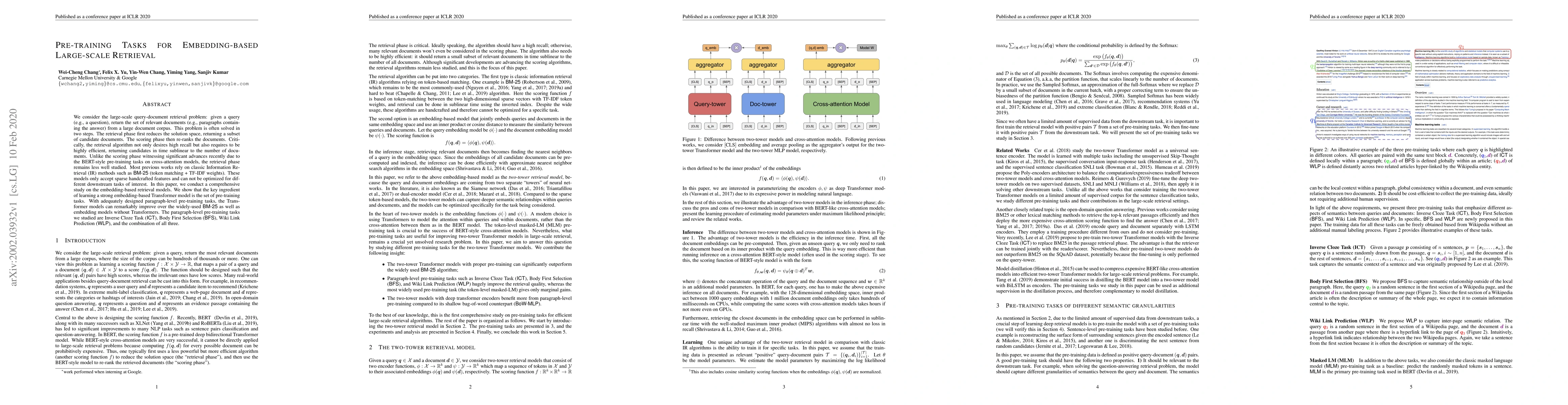We consider the large-scale query-document retrieval problem: given a query (e.g., a question), return the set of relevant documents (e.g., paragraphs containing the answer) from a large document corpus. This problem is often solved in two steps. The retrieval phase first reduces the solution space, returning a subset of candidate documents. The scoring phase then re-ranks the documents. Critically, the retrieval algorithm not only desires high recall but also requires to be highly efficient, returning candidates in time sublinear to the number of documents. Unlike the scoring phase witnessing significant advances recently due to the BERT-style pre-training tasks on cross-attention models, the retrieval phase remains less well studied. Most previous works rely on classic Information Retrieval (IR) methods such as BM-25 (token matching + TF-IDF weights). These models only accept sparse handcrafted features and can not be optimized for different downstream tasks of interest. In this paper, we conduct a comprehensive study on the embedding-based retrieval models. We show that the key ingredient of learning a strong embedding-based Transformer model is the set of pre-training tasks. With adequately designed paragraph-level pre-training tasks, the Transformer models can remarkably improve over the widely-used BM-25 as well as embedding models without Transformers. The paragraph-level pre-training tasks we studied are Inverse Cloze Task (ICT), Body First Selection (BFS), Wiki Link Prediction (WLP), and the combination of all three.