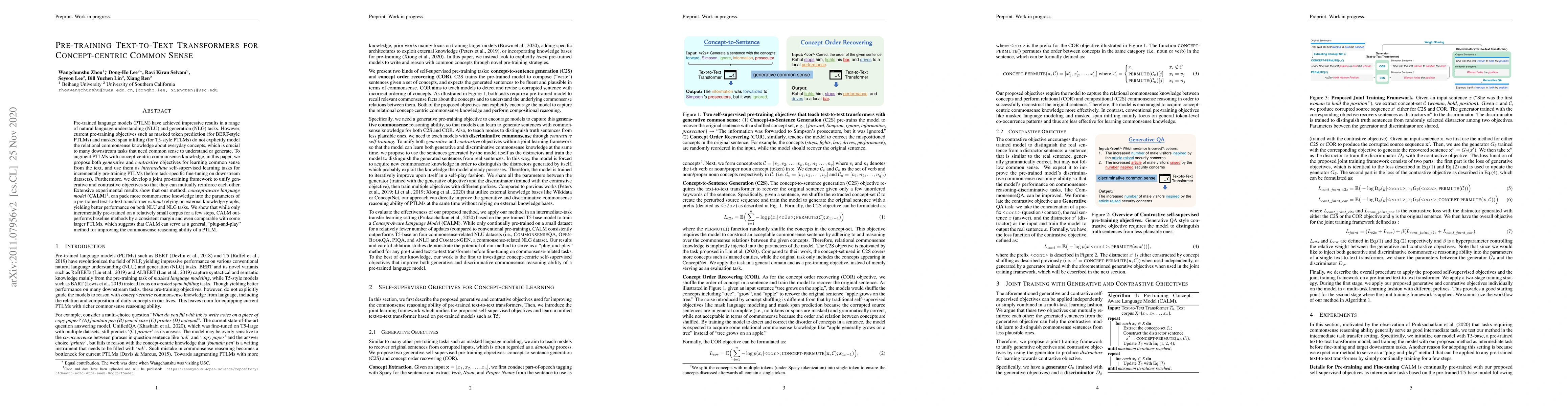 This paper proposes a method to pre-train text-to-text transformers with concept-centric commonsense knowledge using generative and contrastive objectives, resulting in the CALM model. The approach enhances natural language understanding and generation tasks by incorporating more commonsense without external knowledge graphs, outperforming baseline methods.