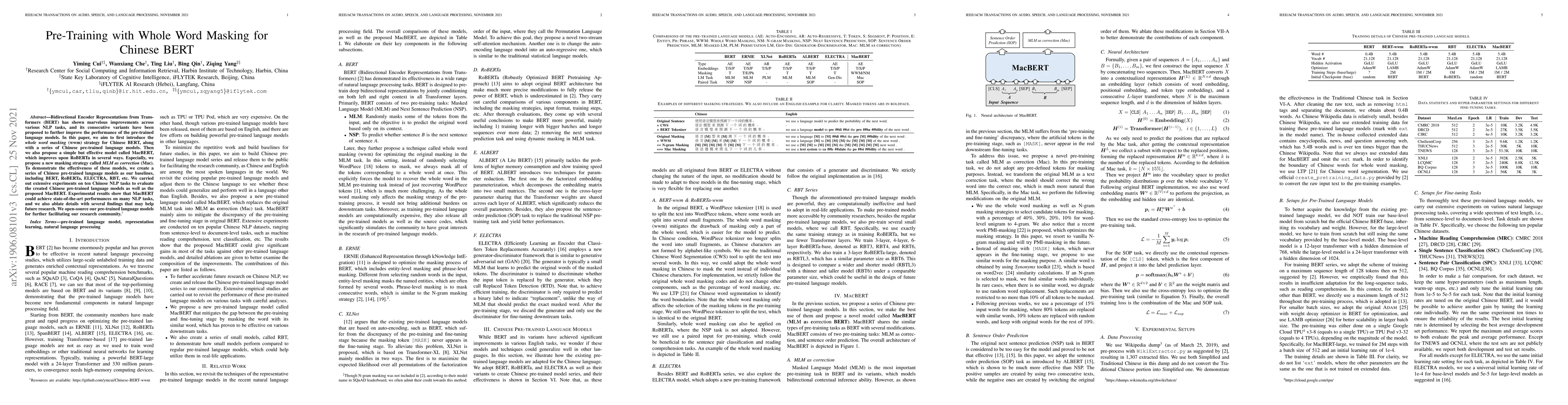 This paper introduces whole word masking (wwm) for Chinese BERT and proposes MacBERT, a variant that outperforms RoBERTa on multiple NLP tasks. Extensive experiments on ten Chinese NLP tasks demonstrate MacBERT's state-of-the-art performance and the authors open-source their models for further research.