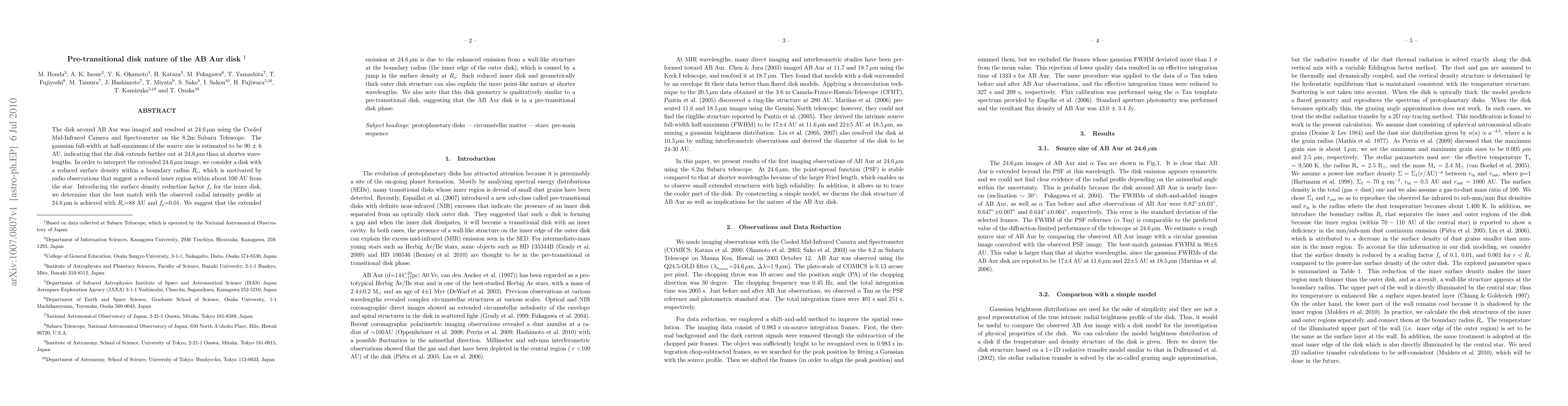 The AB Aur disk, imaged at 24.6 µm, shows an extended structure beyond shorter wavelengths, suggesting a reduced inner region and a wall-like structure at the boundary radius. This geometry aligns with a pre-transitional disk phase, characterized by a geometrically thick outer disk and a surface density reduction factor.