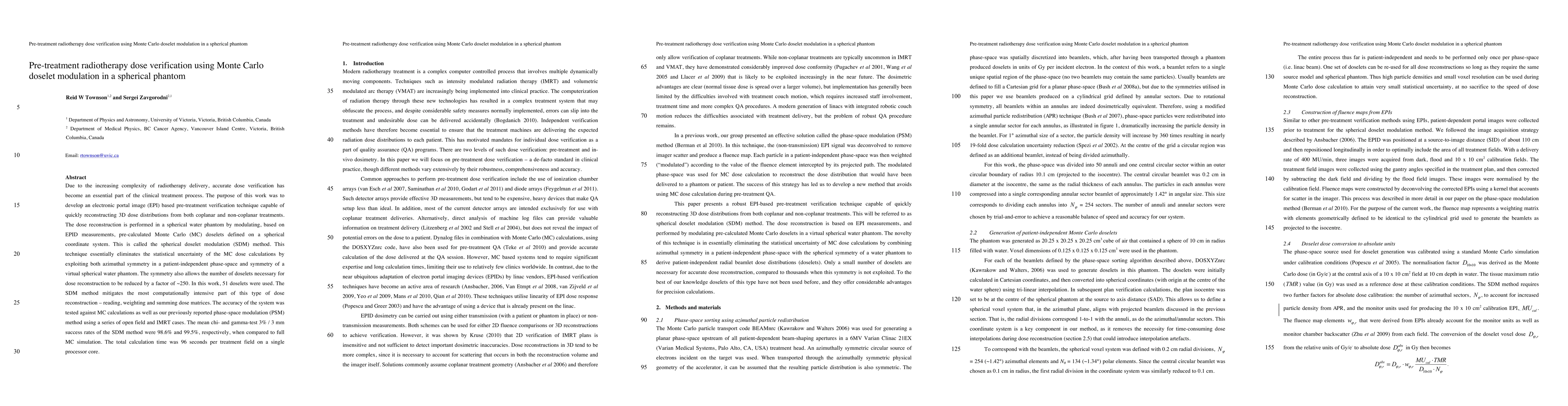 This paper introduces a spherical doselet modulation (SDM) method for pre-treatment radiotherapy verification using Monte Carlo simulations and electronic portal imaging. The SDM method reconstructs 3D dose distributions efficiently by reducing the number of doselets and leveraging symmetry, achieving high accuracy and fast computation times.