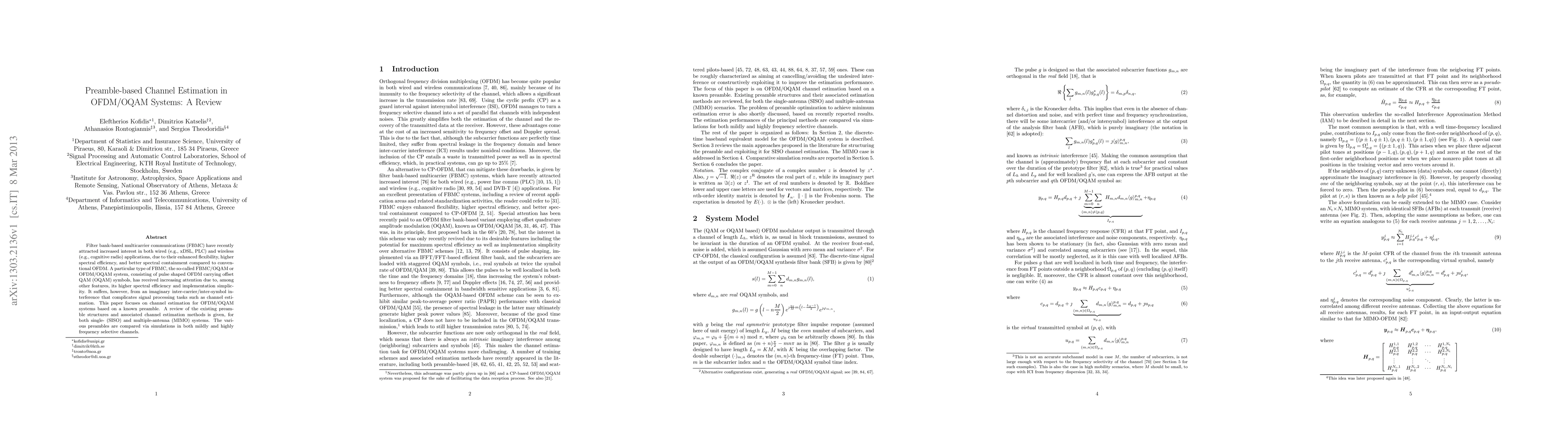 This paper reviews channel estimation techniques for OFDM/OQAM systems using known preambles, comparing various preamble structures and their effectiveness in both single- and multiple-antenna configurations under different channel conditions. The study highlights the complexities introduced by inter-carrier/inter-symbol interference and assesses performance through simulations.