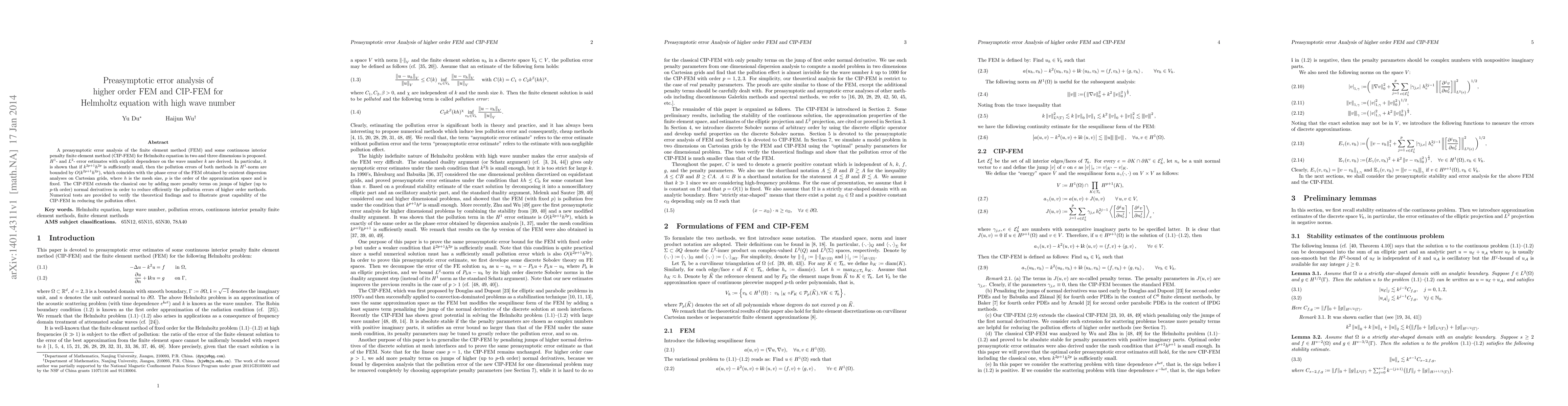 A preasymptotic error analysis of the finite element method (FEM) and some continuous interior penalty finite element method (CIP-FEM) for Helmholtz equation in two and three dimensions is proposed. $H^1$- and $L^2$- error estimates with explicit dependence on the wave number $k$ are derived. In particular, it is shown that if $k^{2p+1}h^{2p}$ is sufficiently small, then the pollution errors of both methods in $H^1$-norm are bounded by $O(k^{2p+1}h^{2p})$, which coincides with the phase error of the FEM obtained by existent dispersion analyses on Cartesian grids, where $h$ is the mesh size, $p$ is the order of the approximation space and is fixed. The CIP-FEM extends the classical one by adding more penalty terms on jumps of higher (up to $p$-th order) normal derivatives in order to reduce efficiently the pollution errors of higher order methods. Numerical tests are provided to verify the theoretical findings and to illustrate great capability of the CIP-FEM in reducing the pollution effect.