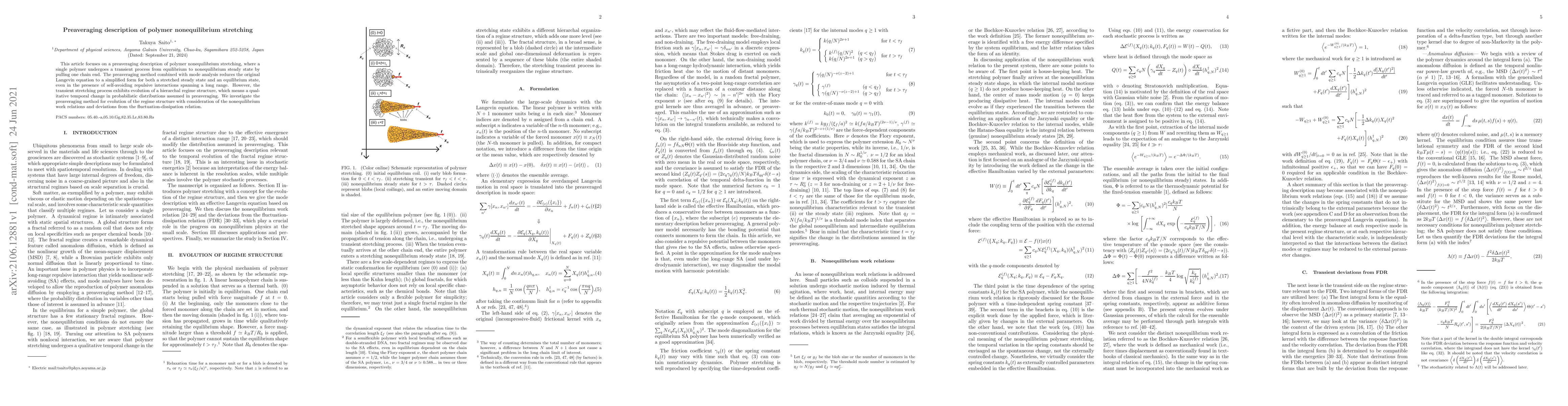 This article focuses on a preaveraging description of polymer nonequilibrium stretching, where a single polymer undergoes a transient process from equilibrium to nonequilibrium steady state by pulling one chain end. The preaveraging method combined with mode analysis reduces the original Langevin equation to a simplified form for both a stretched steady state and an equilibrium state, even in the presence of self-avoiding repulsive interactions spanning a long range. However, the transient stretching process exhibits evolution of a hierarchal regime structure, which means a qualitative temporal change in probabilistic distributions assumed in preaveraging. We investigate the preaveraging method for evolution of the regime structure with consideration of the nonequilibrium work relations and deviations from the fluctuation-dissipation relation.