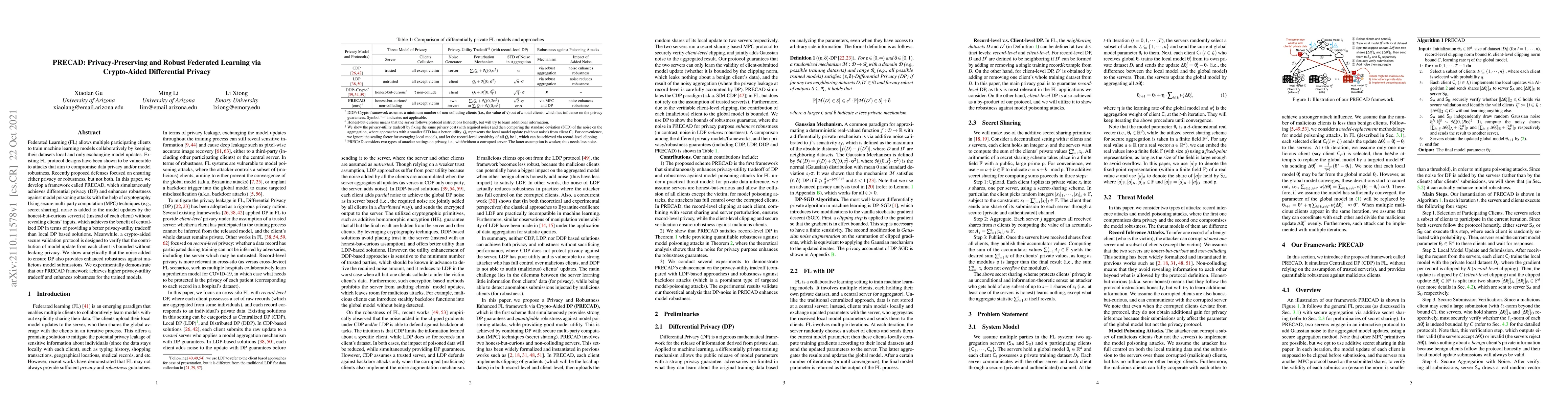 PRECAD is a framework for federated learning that integrates cryptography to achieve both differential privacy and robustness against model poisoning attacks. It uses secure multi-party computation to add noise centrally, enhancing privacy-utility tradeoff and robustness simultaneously.