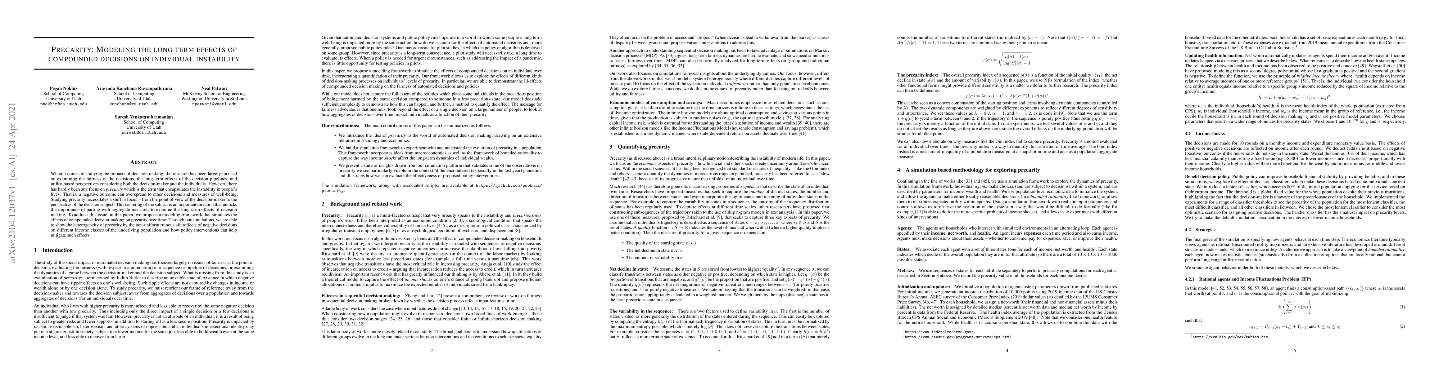 When it comes to studying the impacts of decision making, the research has been largely focused on examining the fairness of the decisions, the long-term effects of the decision pipelines, and utility-based perspectives considering both the decision-maker and the individuals. However, there has hardly been any focus on precarity which is the term that encapsulates the instability in people's lives. That is, a negative outcome can overspread to other decisions and measures of well-being. Studying precarity necessitates a shift in focus - from the point of view of the decision-maker to the perspective of the decision subject. This centering of the subject is an important direction that unlocks the importance of parting with aggregate measures to examine the long-term effects of decision making. To address this issue, in this paper, we propose a modeling framework that simulates the effects of compounded decision-making on precarity over time. Through our simulations, we are able to show the heterogeneity of precarity by the non-uniform ruinous aftereffects of negative decisions on different income classes of the underlying population and how policy interventions can help mitigate such effects.