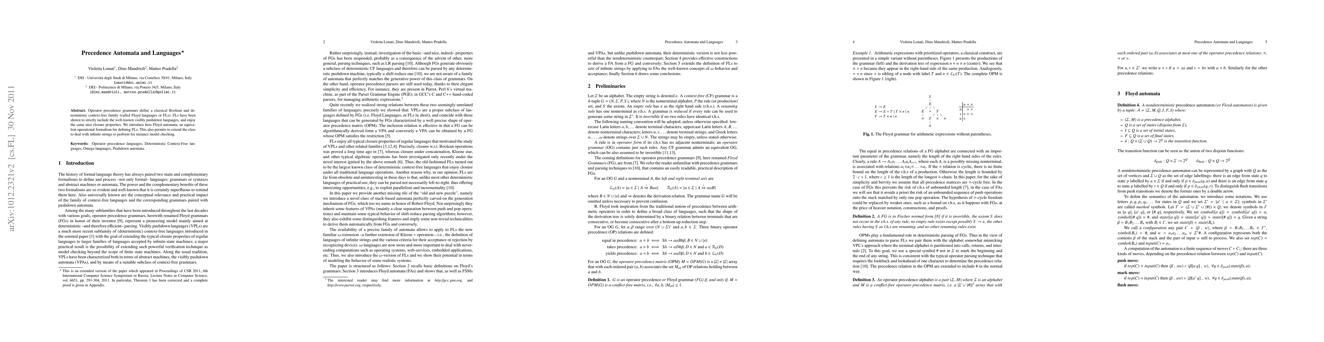 Operator precedence grammars define a classical Boolean and deterministic context-free family (called Floyd languages or FLs). FLs have been shown to strictly include the well-known visibly pushdown languages, and enjoy the same nice closure properties. We introduce here Floyd automata, an equivalent operational formalism for defining FLs. This also permits to extend the class to deal with infinite strings to perform for instance model checking.