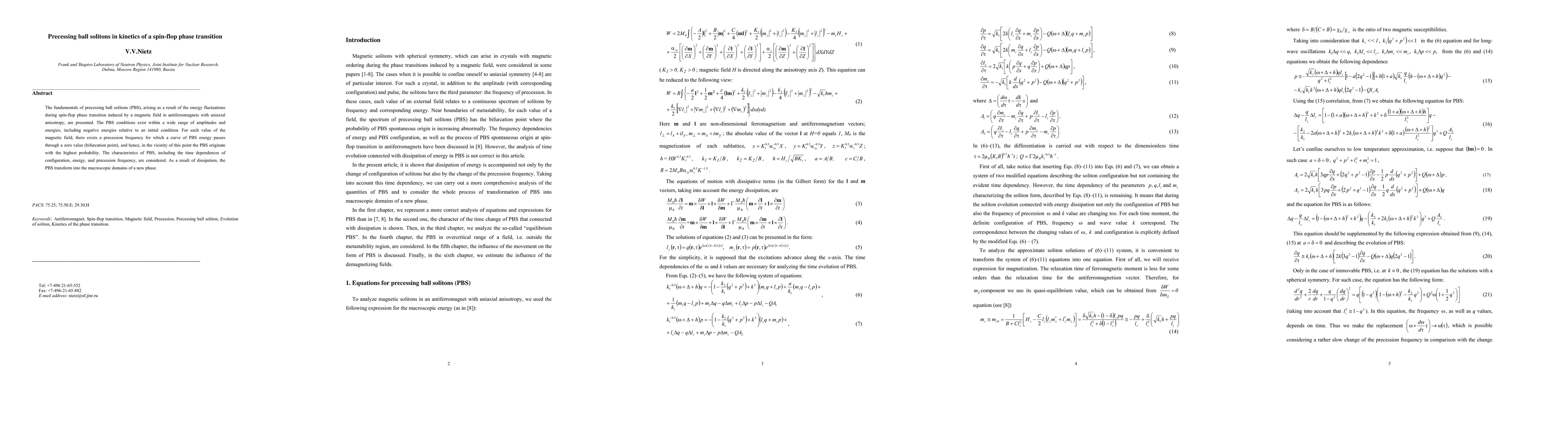 The fundamentals of precessing ball solitons (PBS), arising as a result of the energy fluctuations during spin-flop phase transition induced by a magnetic field in antiferromagnets with uniaxial anisotropy, are presented. The PBS conditions exist within a wide range of amplitudes and energies, including negative energies relative to an initial condition. For each value of the magnetic field, there exists a precession frequency for which a curve of PBS energy passes through a zero value (bifurcation point), and hence, in the vicinity of this point the PBS originate with the highest probability. The characteristics of PBS, including the time dependences of configuration, energy, and precession frequency, are considered. As a result of dissipation, the PBS transform into the macroscopic domains of a new phase.