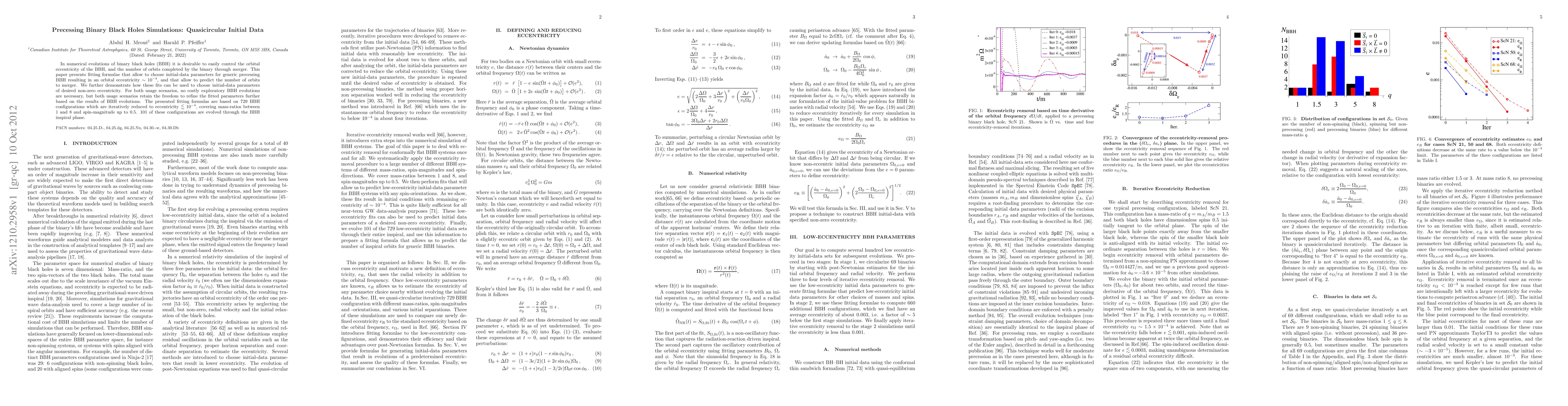 This paper introduces fitting formulae for generating quasicircular initial data for precessing binary black hole simulations, allowing for controlled eccentricity and prediction of merger orbits. The fitting is based on 729 configurations, refined to low eccentricity, and validated through evolution of 101 configurations.