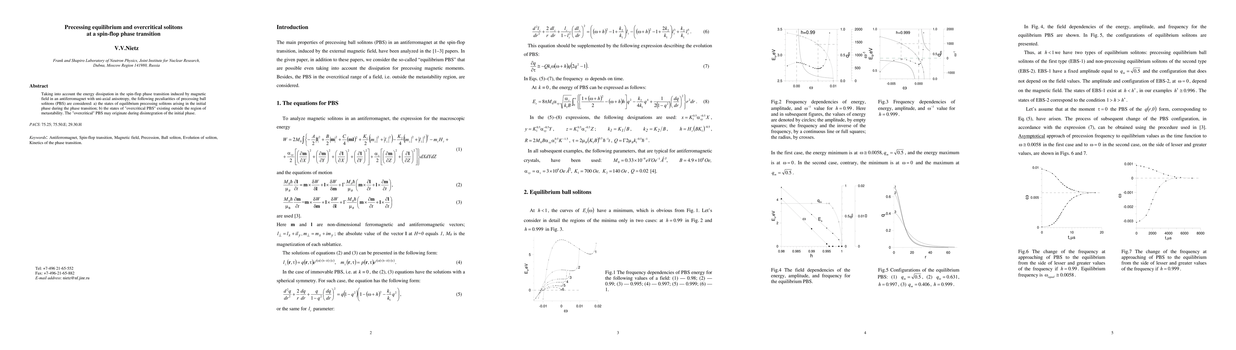 This paper investigates the behavior of precessing ball solitons (PBS) during the spin-flop phase transition in an antiferromagnet, focusing on equilibrium precessing solitons and "overcritical PBS" that exist outside the metastable region, potentially arising from the disintegration of the initial phase.