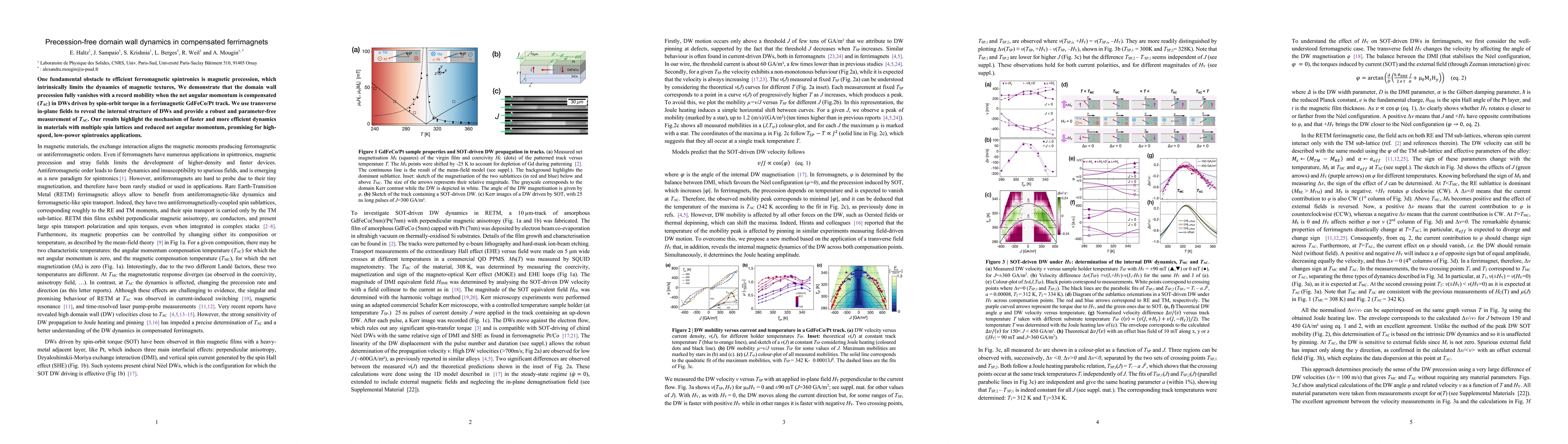 This paper demonstrates that domain wall precession is eliminated in compensated ferrimagnets, achieving record mobility driven by spin-orbit torque in GdFeCo/Pt tracks. The study reveals the internal structure of domain walls using transverse in-plane fields, highlighting the potential for high-speed, low-power spintronics in materials with reduced net angular momentum.