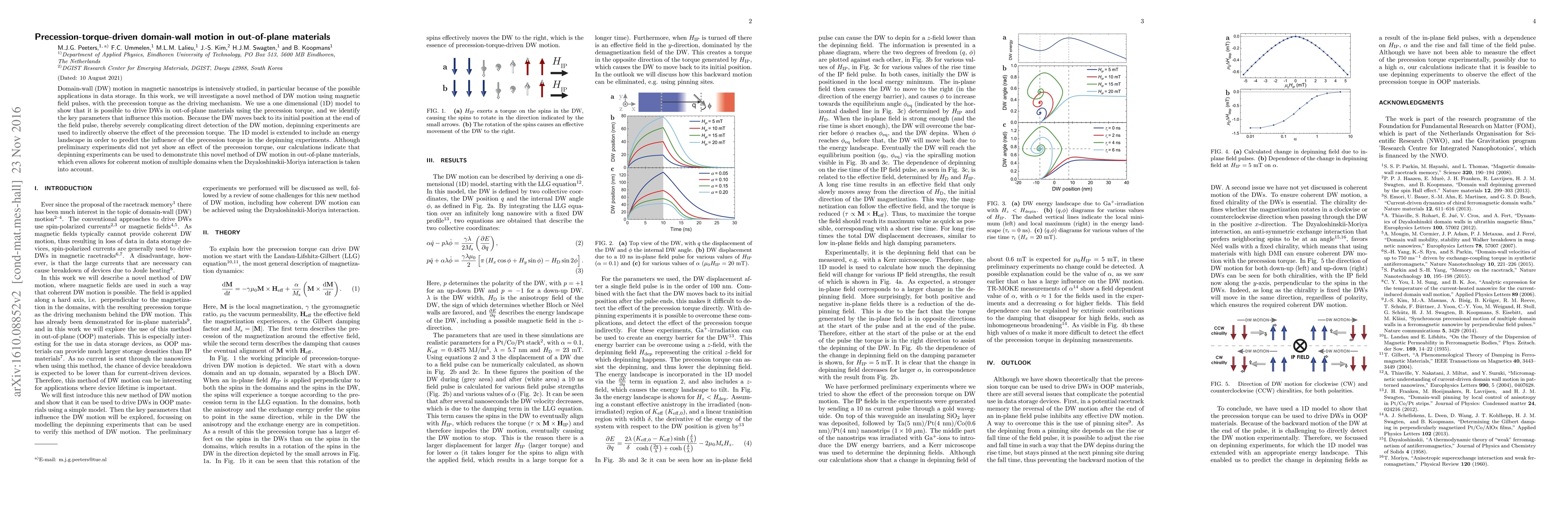 Domain-wall (DW) motion in magnetic nanostrips is intensively studied, in particular because of the possible applications in data storage. In this work, we will investigate a novel method of DW motion using magnetic field pulses, with the precession torque as the driving mechanism. We use a one dimensional (1D) model to show that it is possible to drive DWs in out-of-plane materials using the precession torque, and we identify the key parameters that influence this motion. Because the DW moves back to its initial position at the end of the field pulse, thereby severely complicating direct detection of the DW motion, depinning experiments are used to indirectly observe the effect of the precession torque. The 1D model is extended to include an energy landscape in order to predict the influence of the precession torque in the depinning experiments. Although preliminary experiments did not yet show an effect of the precession torque, our calculations indicate that depinning experiments can be used to demonstrate this novel method of DW motion in out-of-plane materials, which even allows for coherent motion of multiple domains when the Dzyaloshinskii-Moriya interaction is taken into account.