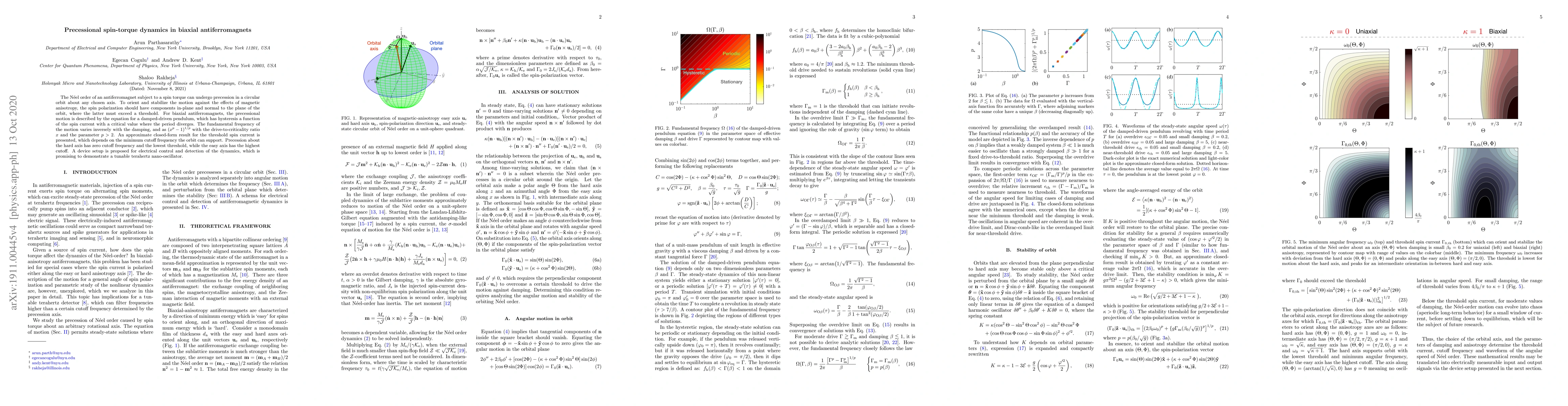 The N\'eel order of an antiferromagnet subject to a spin torque can undergo precession in a circular orbit about any chosen axis. To orient and stabilize the motion against the effects of magnetic anisotropy, the spin polarization should have components in-plane and normal to the plane of the orbit, where the latter must exceed a threshold. For biaxial antiferromagnets, the precessional motion is described by the equation for a damped-driven pendulum, which has hysteresis a function of the spin current with a critical value where the period diverges. The fundamental frequency of the motion varies inversely with the damping, and as $(x^p-1)^{1/p}$ with the drive-to-criticality ratio $x$ and the parameter $p>2$. An approximate closed-form result for the threshold spin current is presented, which depends on the minimum cutoff frequency the orbit can support. Precession about the hard axis has zero cutoff frequency and the lowest threshold, while the easy axis has the highest cutoff. A device setup is proposed for electrical control and detection of the dynamics, which is promising to demonstrate a tunable terahertz nano-oscillator.