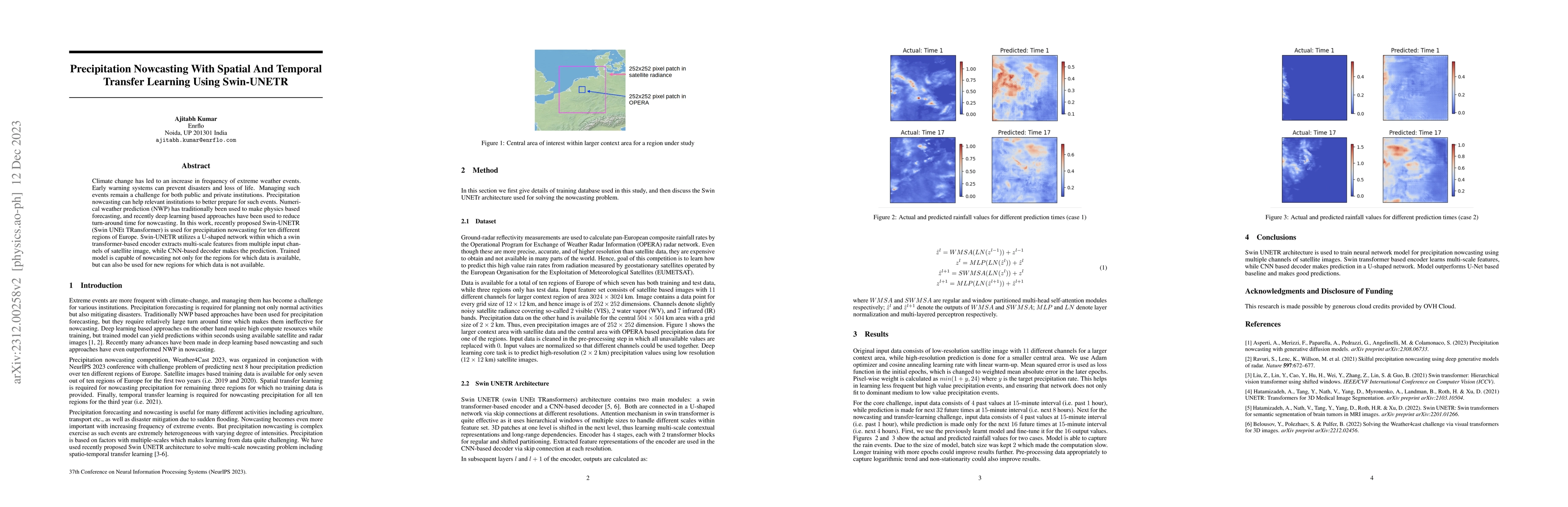 This paper explores the use of Swin-UNETR for precipitation nowcasting across ten European regions, leveraging spatial and temporal transfer learning to enhance prediction accuracy. The model, combining a Swin transformer encoder and CNN decoder, demonstrates effective forecasting even for regions with no prior data.