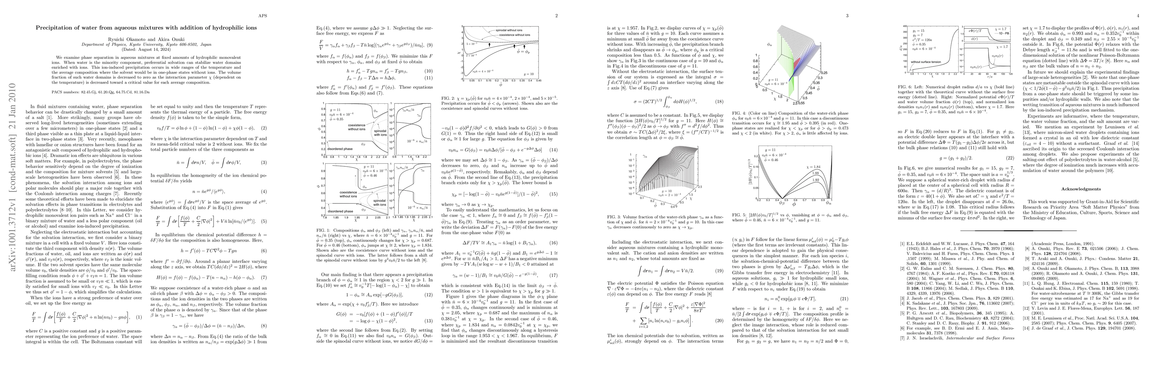 Summary: This study investigates phase separation in aqueous mixtures containing hydrophilic ions, revealing that ion-induced precipitation can stabilize water domains enriched with ions, even when water is the minority component. The phenomenon occurs across a broad range of temperatures and compositions, with the volume fraction of these water domains diminishing as the interaction parameter $\chi$ approaches a critical value.