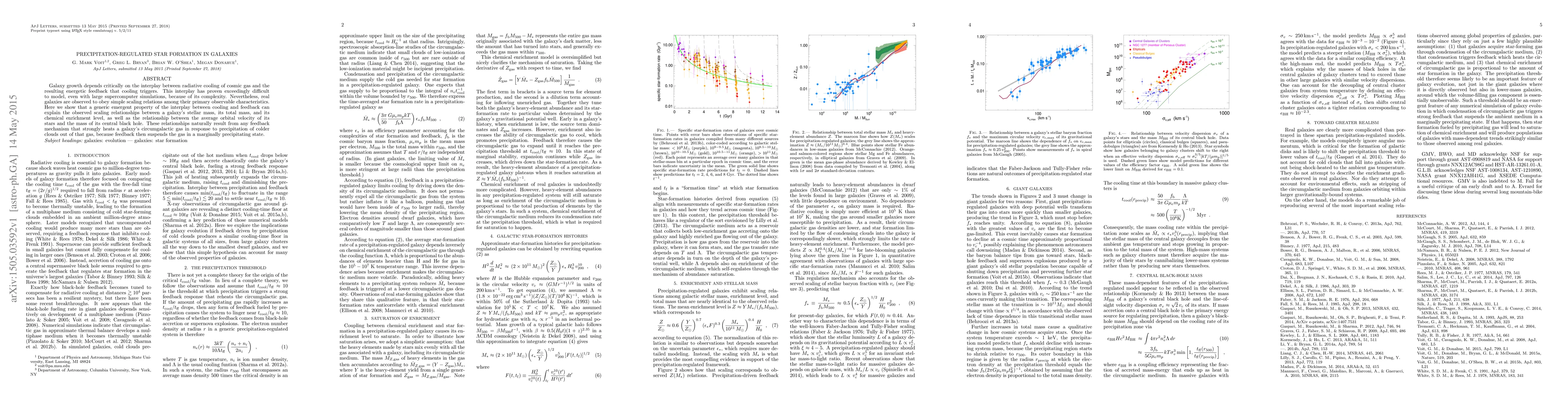 Galaxy growth depends critically on the interplay between radiative cooling of cosmic gas and the resulting energetic feedback that cooling triggers. This interplay has proven exceedingly difficult to model, even with large supercomputer simulations, because of its complexity. Nevertheless, real galaxies are observed to obey simple scaling relations among their primary observable characteristics. Here we show that a generic emergent property of the interplay between cooling and feedback can explain the observed scaling relationships between a galaxy's stellar mass, its total mass, and its chemical enrichment level, as well as the relationship between the average orbital velocity of its stars and the mass of its central black hole. These relationships naturally result from any feedback mechanism that strongly heats a galaxy's circumgalactic gas in response to precipitation of colder clouds out of that gas, because feedback then suspends the gas in a marginally precipitating state.