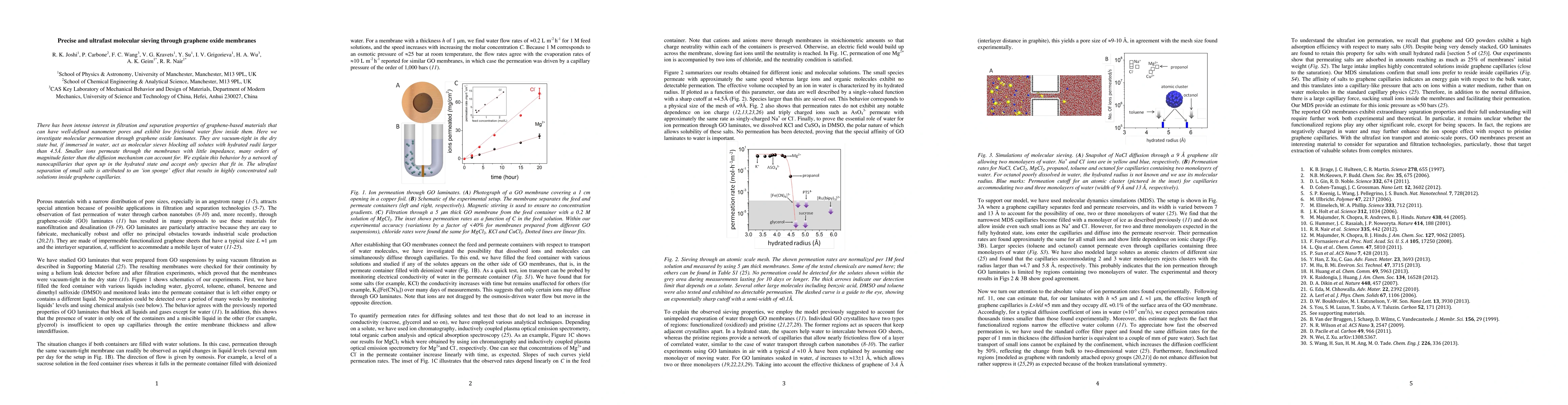 Graphene oxide laminates act as molecular sieves in water, blocking solutes larger than 4.5Å while allowing small ions to pass rapidly through a network of nanocapillaries, demonstrating an 'ion sponge' effect for ultrafast separation. This unique filtration mechanism is attributed to the formation of nanocapillaries in the hydrated state.