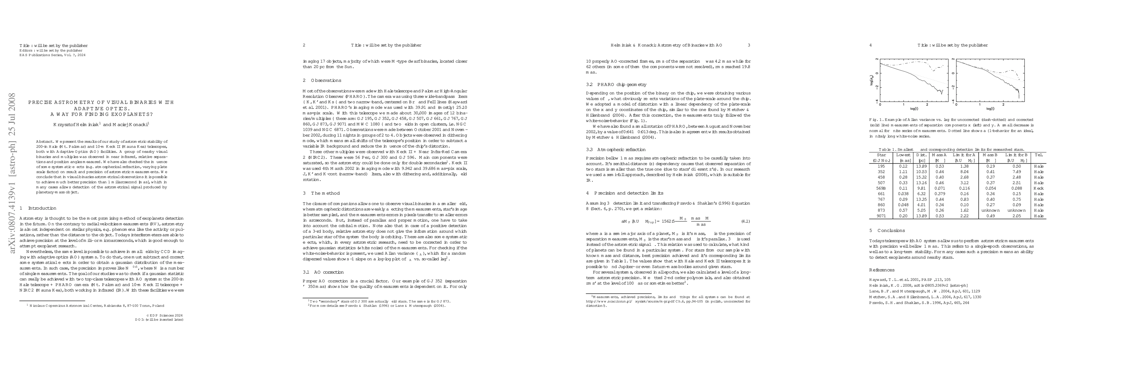 We present the results of our study of astrometric stability of 200-in Hale (Mt. Palomar) and 10-m Keck II (Mauna Kea) telescopes, both with Adaptive Optics (AO) facilities. A group of nearby visual binaries and multiples was observed in near infrared, relative separations and position angles measured. We have also checked the influence of some systematic effects (e.g. atmospherical refraction, varying plate scale factor) on result and precision of astrometric measurements. We conclude that in visual binaries astrometrical observations it is possible to achieve much better precision than 1 miliarcsecond, which in many cases allows detection of the astrometrical signal produced by planetary-mass object.