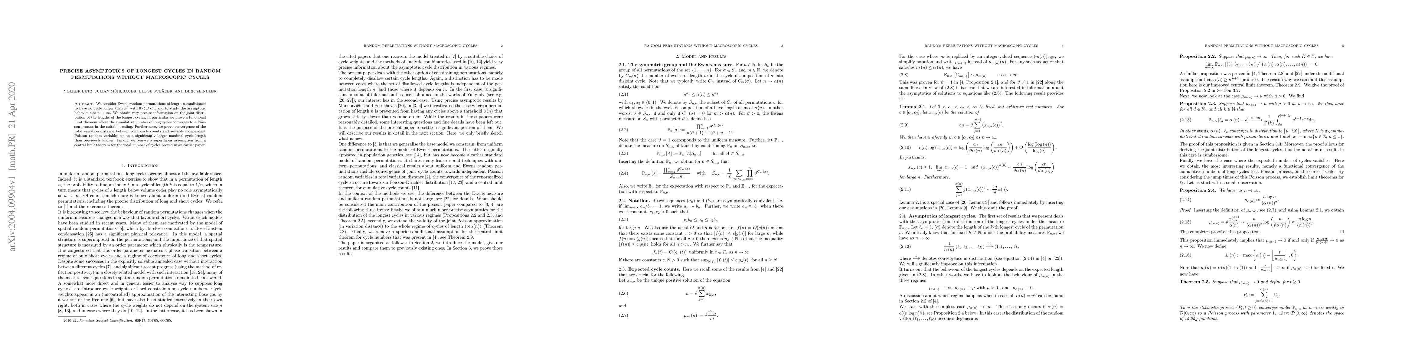 This paper studies Ewens random permutations of length $n$ conditioned to exclude cycles longer than $n^\beta$ ($0<\beta<1$), focusing on the asymptotic behavior as $n$ grows. It provides precise information on the joint distribution of the longest cycles, proving a functional limit theorem and convergence of the total variation distance to independent Poisson random variables.
