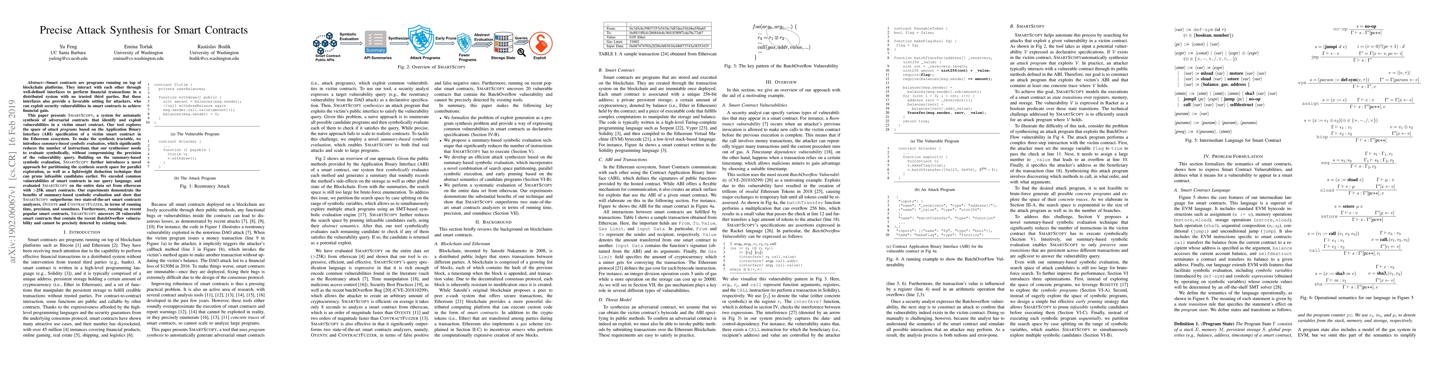 Smart contracts are programs running on top of blockchain platforms. They interact with each other through well-defined interfaces to perform financial transactions in a distributed system with no trusted third parties. But these interfaces also provide a favorable setting for attackers, who can exploit security vulnerabilities in smart contracts to achieve financial gain. This paper presents SmartScopy, a system for automatic synthesis of adversarial contracts that identify and exploit vulnerabilities in a victim smart contract. Our tool explores the space of \emph{attack programs} based on the Application Binary Interface (ABI) specification of a victim smart contract in the Ethereum ecosystem. To make the synthesis tractable, we introduce \emph{summary-based symbolic evaluation}, which significantly reduces the number of instructions that our synthesizer needs to evaluate symbolically, without compromising the precision of the vulnerability query. Building on the summary-based symbolic evaluation, SmartScopy further introduces a novel approach for partitioning the synthesis search space for parallel exploration, as well as a lightweight deduction technique that can prune infeasible candidates earlier. We encoded common vulnerabilities of smart contracts in our query language, and evaluated SmartScopy on the entire data set from etherscan with $>$25K smart contracts. Our experiments demonstrate the benefits of summary-based symbolic evaluation and show that SmartScopy outperforms two state-of-the-art smart contracts analyzers, Oyente and Contractfuzz, in terms of running time, precision, and soundness. Furthermore, running on recent popular smart contracts, SmartScopy uncovers 20 vulnerable smart contracts that contain the recent BatchOverflow vulnerability and cannot be precisely detected by existing tools.