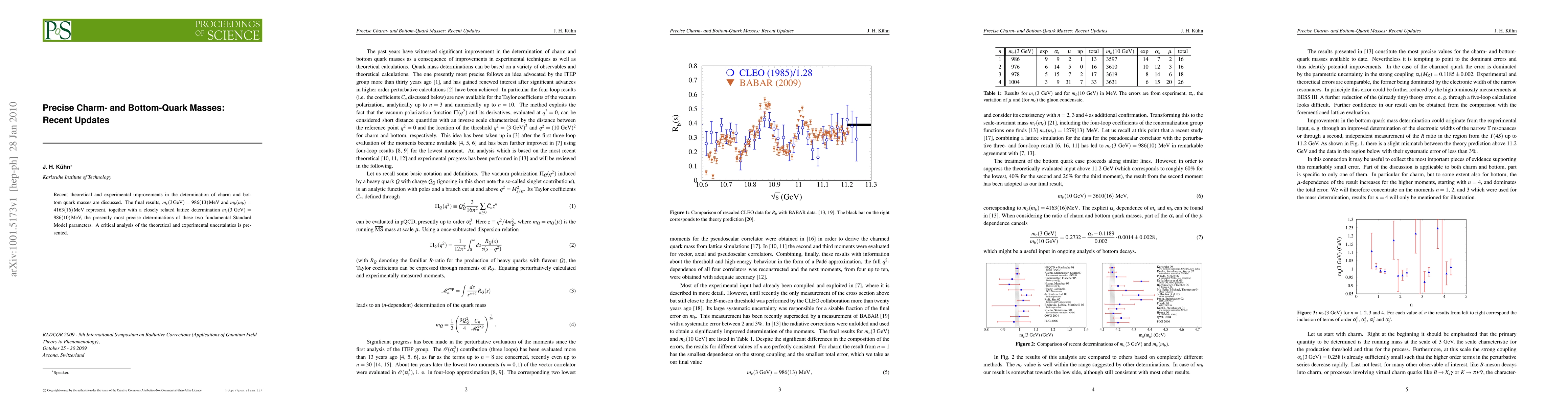 This paper presents the latest precise determinations of charm and bottom quark masses, reporting $m_c(3 \text{GeV})=986(13) $MeV and $m_b(m_b)=4163(16) $MeV, with significant improvements from both theoretical and experimental methods. It also critically analyzes the associated uncertainties.
