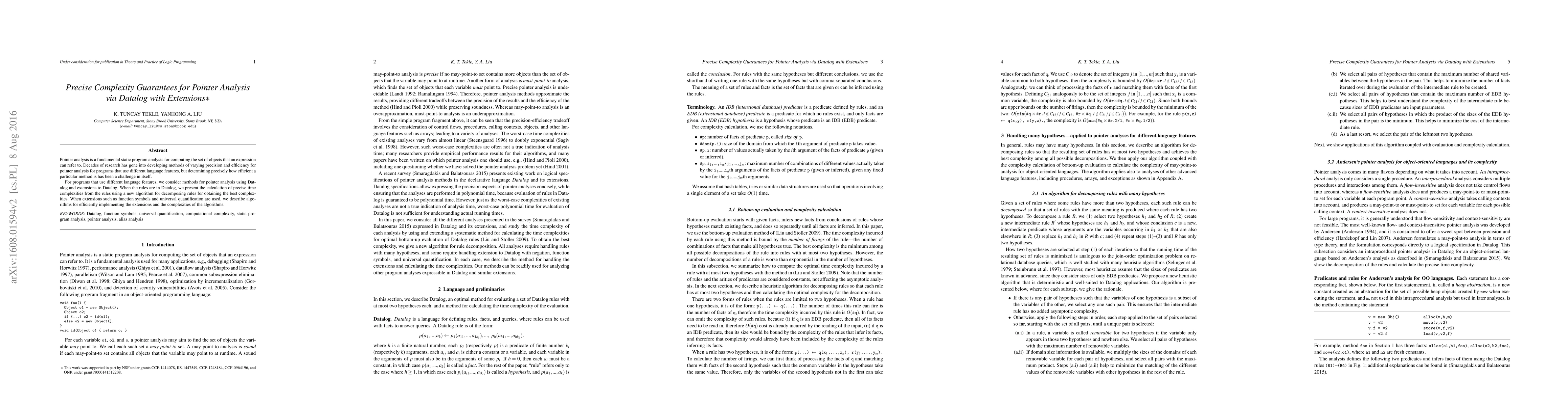 This paper presents precise complexity guarantees for pointer analysis using Datalog and its extensions. It introduces a new algorithm for calculating precise time complexities from Datalog rules and describes efficient algorithms for implementing extensions like function symbols and universal quantification.