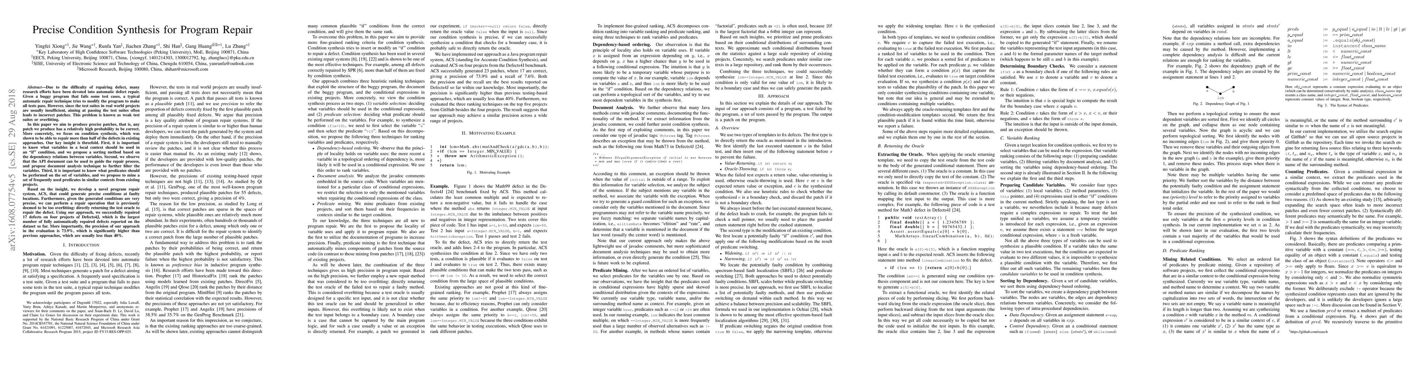 This paper proposes a novel approach for precise condition synthesis in automatic program repair, focusing on selecting appropriate variables and predicates to generate accurate patches. The method uses dependency relations, API documentation, and mined predicates from similar projects to enhance repair precision, achieving a 73.9% precision rate on Defects4J, significantly outperforming previous methods.