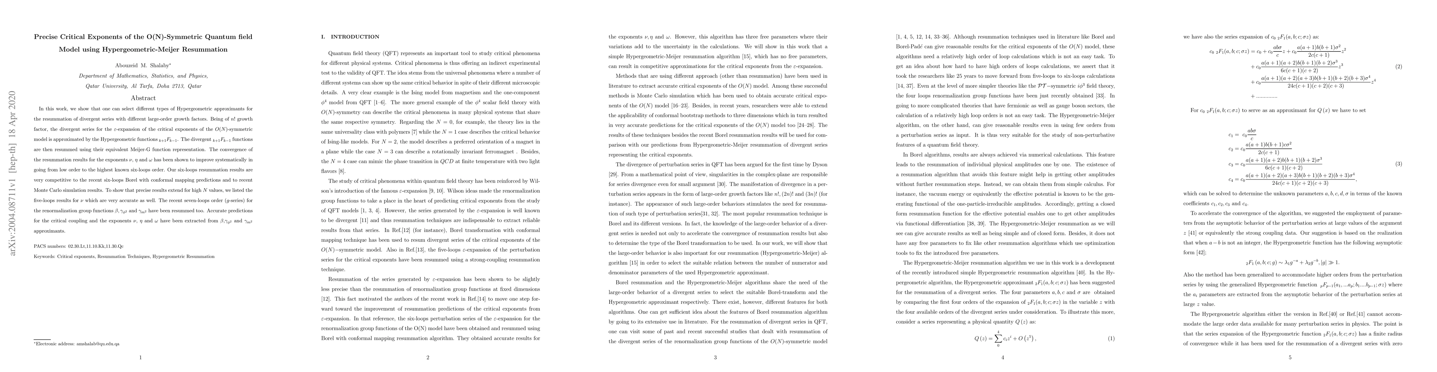 This paper demonstrates the use of Hypergeometric-Meijer resummation techniques to accurately determine critical exponents in the $O(N)$-symmetric quantum field model, showing improved convergence up to six-loops. The method provides results competitive with recent six-loops Borel predictions and Monte Carlo simulations, extending precise results to high $N$ values.