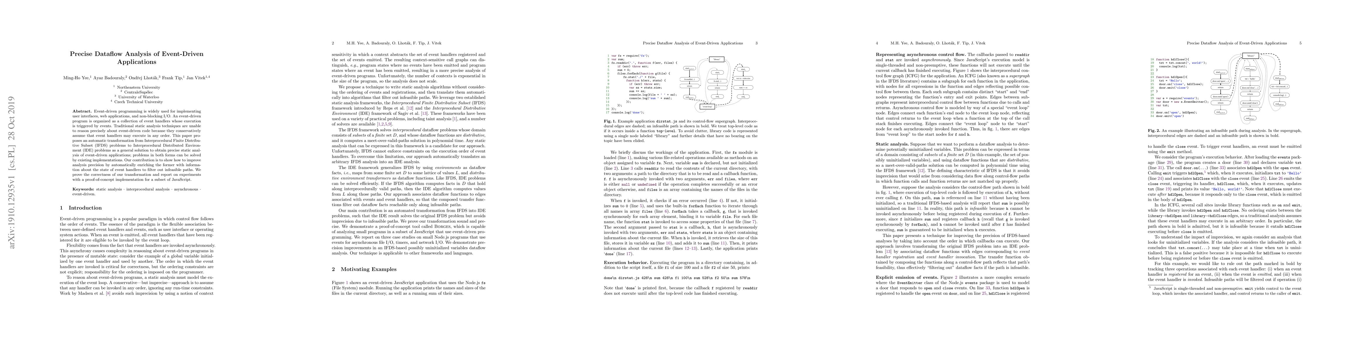 Event-driven programming is widely used for implementing user interfaces, web applications, and non-blocking I/O. An event-driven program is organized as a collection of event handlers whose execution is triggered by events. Traditional static analysis techniques are unable to reason precisely about event-driven code because they conservatively assume that event handlers may execute in any order. This paper proposes an automatic transformation from Interprocedural Finite Distributive Subset (IFDS) problems to Interprocedural Distributed Environment (IDE) problems as a general solution to obtain precise static analysis of event-driven applications; problems in both forms can be solved by existing implementations. Our contribution is to show how to improve analysis precision by automatically enriching the former with information about the state of event handlers to filter out infeasible paths. We prove the correctness of our transformation and report on experiments with a proof-of-concept implementation for a subset of JavaScript.