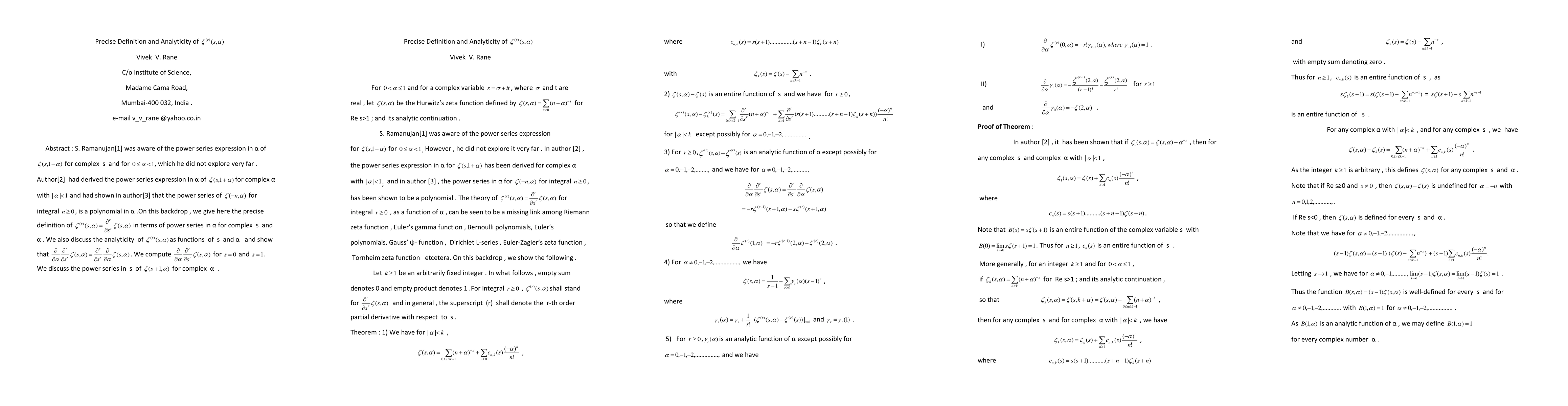 S.Ramanujan[1] was aware of power series expression in alpha of zeta(s,1-alpha)for complex s and for 0<=alpha<1,which he did not explore very far.Author[2] had derived power series expression in alpha of zeta(s,1+alpha)for complex {\alpha} with |alpha|<1 and had shown in author[3] that the power series of zeta(-n,alpha) for integral n>=0,is a polynomial in {\alpha} .On this backdrop, we give here the precise definition of r-th order partial derivative w.r.t s of zeta(s,alpha) in terms of power series in alpha for complex s and alpha . We also discuss the analyticity of r-th order partial derivative w.r.t s of zeta(s,alpha) as functions of s and alpha and show that partial derivatives w.r.t s and alpha commute.We compute partial derivative w.r.t alpha of r-th order partial derivative w.r.t. s of zeta(s,alpha)for s=0 and s=1.We discuss the power series in s of zeta(s+1,alpha) for complex alpha.