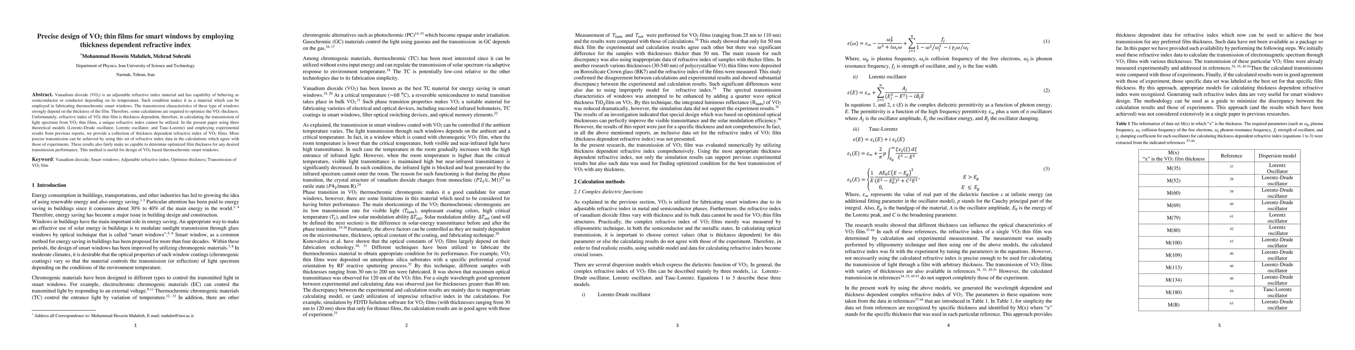 Vanadium dioxide (VO2) is an adjustable refractive index material and has capability of behaving as semiconductor or conductor depending on its temperature. Such condition makes it as a material which can be employed in fabricating thermochromic smart windows. The transmission characteristics of these type of windows strongly depend on the thickness of the film. Therefore, some calculations are required to optimize the VO2 thickness. Unfortunately, refractive index of VO2 thin film is thickness dependent, therefore, in calculating the transmission of light spectrum from VO2 thin films, a unique refractive index cannot be utilized. In the present paper using three theoretical models (Lorentz-Drude oscillator, Lorentz oscillator, and Tauc-Lorentz) and employing experimental results from previous reports, we provide a collection of thickness dependent refractive index of VO2 films. More precise transmission can be achieved by using this set of refractive index data in the calculations which agree with those of experiments. These results also fairly make us capable to determine optimized film thickness for any desired transmission performance. This method is useful for design of VO2 based thermochromic smart windows.