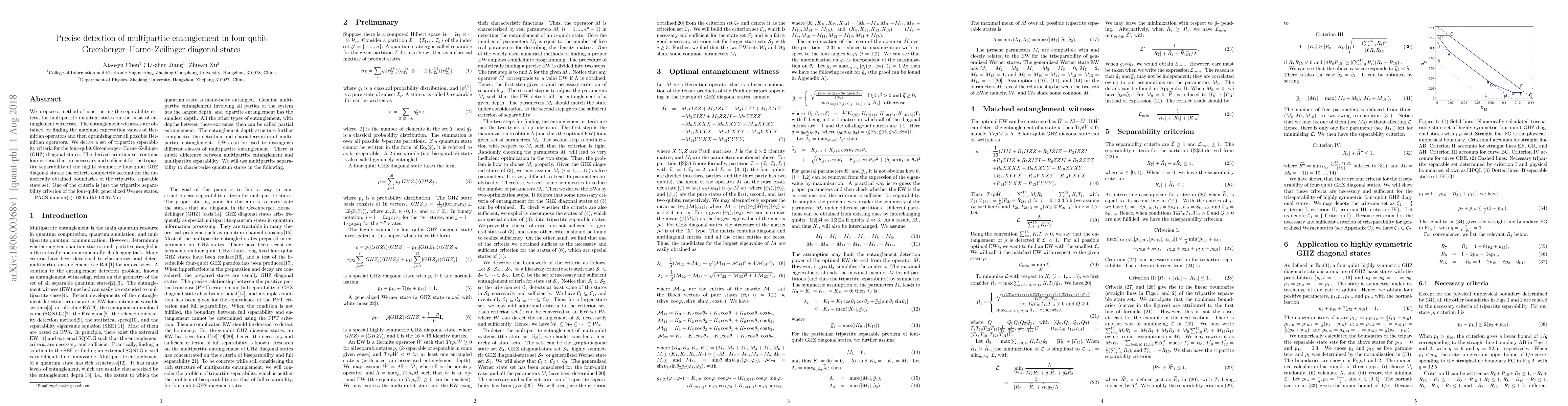 This paper proposes a method to construct separability criteria for multipartite quantum states using entanglement witnesses, specifically for four-qubit GHZ diagonal states. The authors derive four necessary and sufficient criteria for tripartite separability, which match numerically obtained boundaries and include the separability criterion for generalized Werner states.