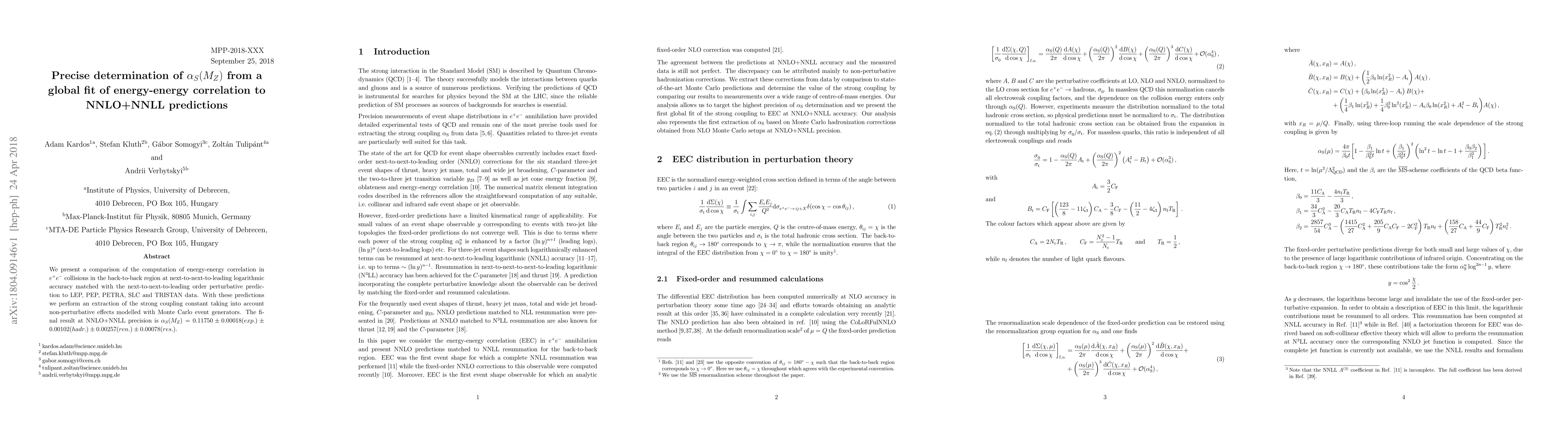 We present a comparison of the computation of energy-energy correlation in $e^{+}e^{-}$ collisions in the back-to-back region at next-to-next-to-leading logarithmic accuracy matched with the next-to-next-to-leading order perturbative prediction to LEP, PEP, PETRA, SLC and TRISTAN data. With these predictions we perform an extraction of the strong coupling constant taking into account non-perturbative effects modelled with Monte Carlo event generators. The final result at NNLO+NNLL precision is $\alpha_{S}(M_{Z})=0.11750\pm 0.00018 {\text( exp.)}\pm 0.00102{\text(hadr.)}\pm0.00257{\text(ren.)}\pm 0.00078{\text(res.)}$.