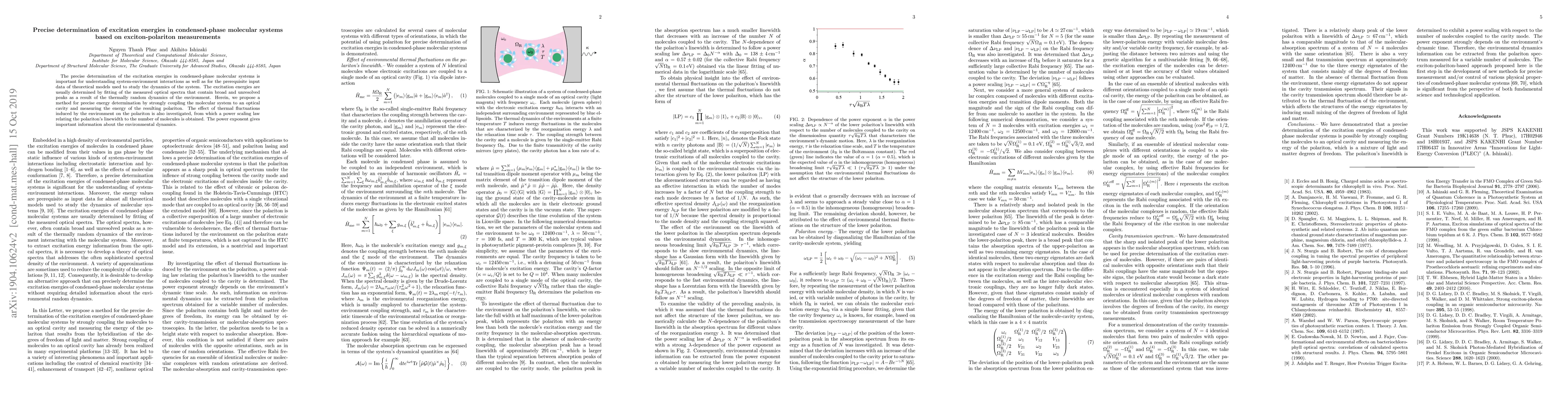 The precise determination of the excitation energies in condensed-phase molecular systems is important for understanding system-environment interactions as well as for the prerequisite input data of theoretical models used to study the dynamics of the system. The excitation energies are usually determined by fitting of the measured optical spectra that contain broad and unresolved peaks as a result of the thermally random dynamics of the environment. Herein, we propose a method for precise energy determination by strongly coupling the molecular system to an optical cavity and measuring the energy of the resulting polariton. The effect of thermal fluctuations induced by the environment on the polariton is also investigated, from which a power scaling law relating the polariton's linewidth to the number of molecules is obtained. The power exponent gives important information about the environmental dynamics.