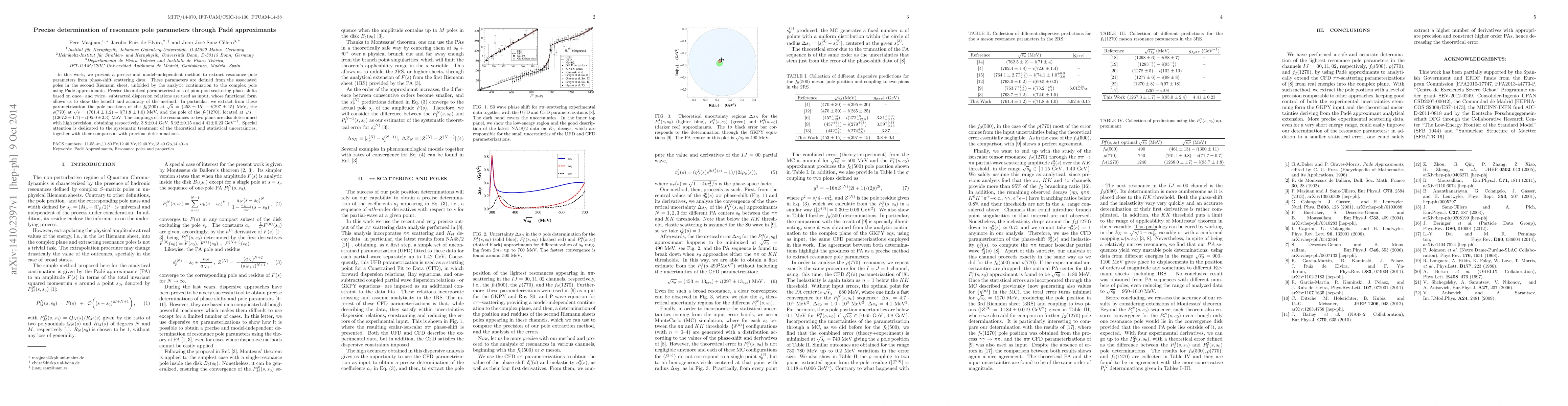 In this work, we present a precise and model--independent method to extract resonance pole parameters from phase-shift scattering data. These parameters are defined from the associated poles in the second Riemann sheet, unfolded by the analytic continuation to the complex pole using Pad\'e approximants. Precise theoretical parameterizations of pion-pion scattering phase shifts based on once-- and twice-- subtracted dispersion relations are used as input, whose functional form allows us to show the benefit and accuracy of the method. In particular, we extract from these parametrization the pole positions of the $f_0(500)$ at $\sqrt{s}=(453\pm 15) - i(297 \pm 15)$ MeV, the $\rho(770)$ at $\sqrt{s}=(761.4\pm 1.2)-i(71.8 \pm 1.0)$ MeV, and the pole of the $f_2(1270)$, located at $\sqrt{s}=(1267.3\pm 1.7)-i(95.0\pm 2.3)$ MeV. The couplings of the resonances to two pions are also determined with high precision, obtaining respectively, $3.8\pm 0.4$ GeV, $5.92\pm 0.15$ and $4.41\pm 0.23$ GeV$^{-1}$. Special attention is dedicated to the systematic treatment of the theoretical and statistical uncertainties, together with their comparison with previous determinations.