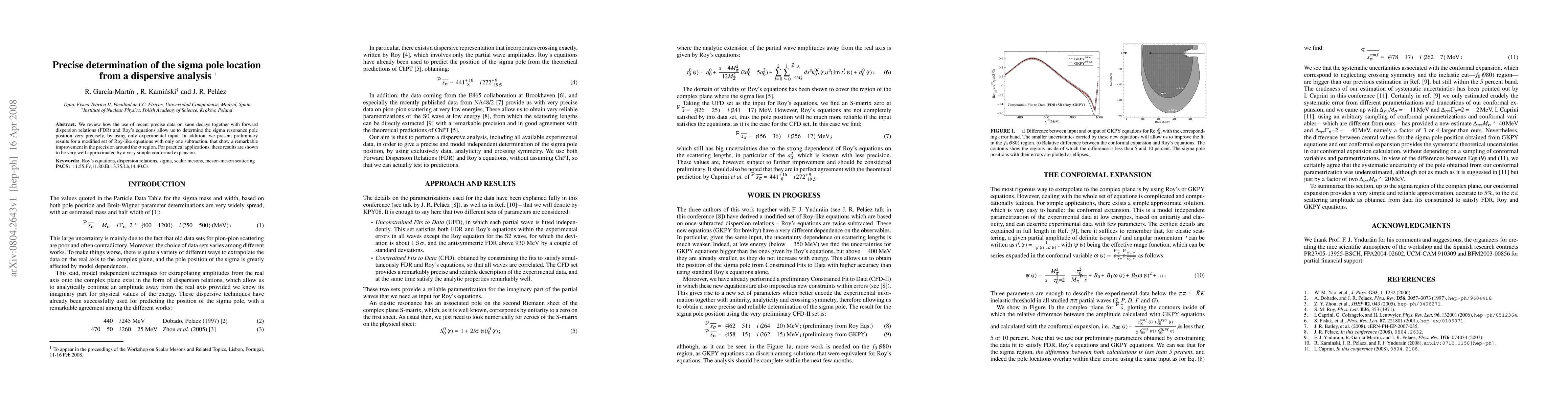 We review how the use of recent precise data on kaon decays together with forward dispersion relations (FDR) and Roy's equations allow us to determine the sigma resonance pole position very precisely, by using only experimental input. In addition, we present preliminary results for a modified set of Roy-like equations with only one subtraction, that show a remarkable improvement in the precision around the sigma resonance region. For practical applications, these results are shown to be very well approximated by a very simple conformal expansion.