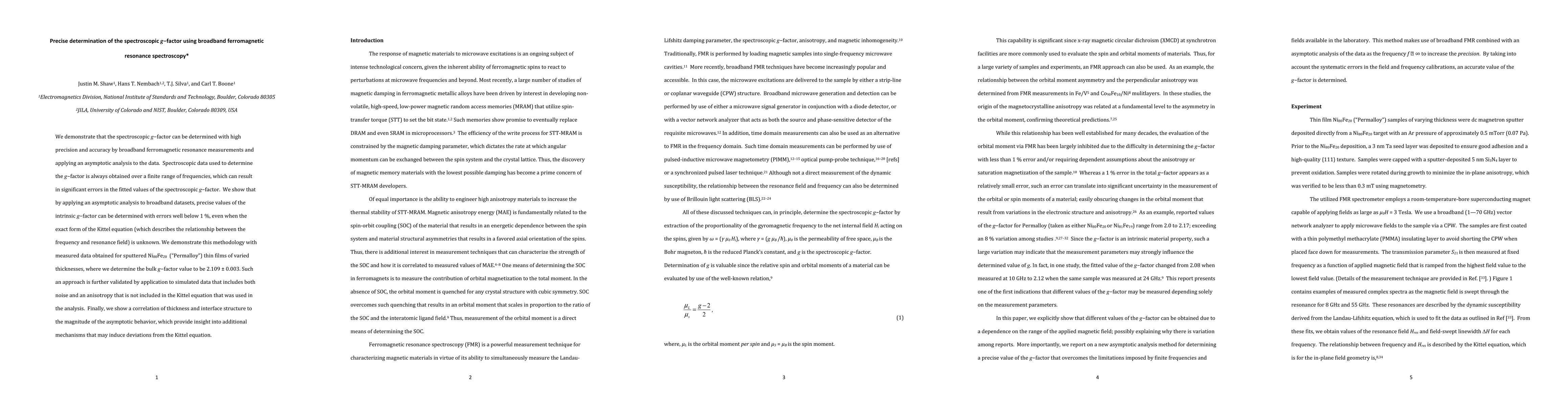 The paper presents a method to precisely determine the spectroscopic g-factor using broadband ferromagnetic resonance measurements and asymptotic analysis, achieving errors below 1%. This approach is demonstrated with Ni80Fe20 thin films, yielding a bulk g-factor value of 2.109 ± 0.003. The method is validated with simulated data and reveals correlations between film thickness, interface structure, and deviations from the Kittel equation.