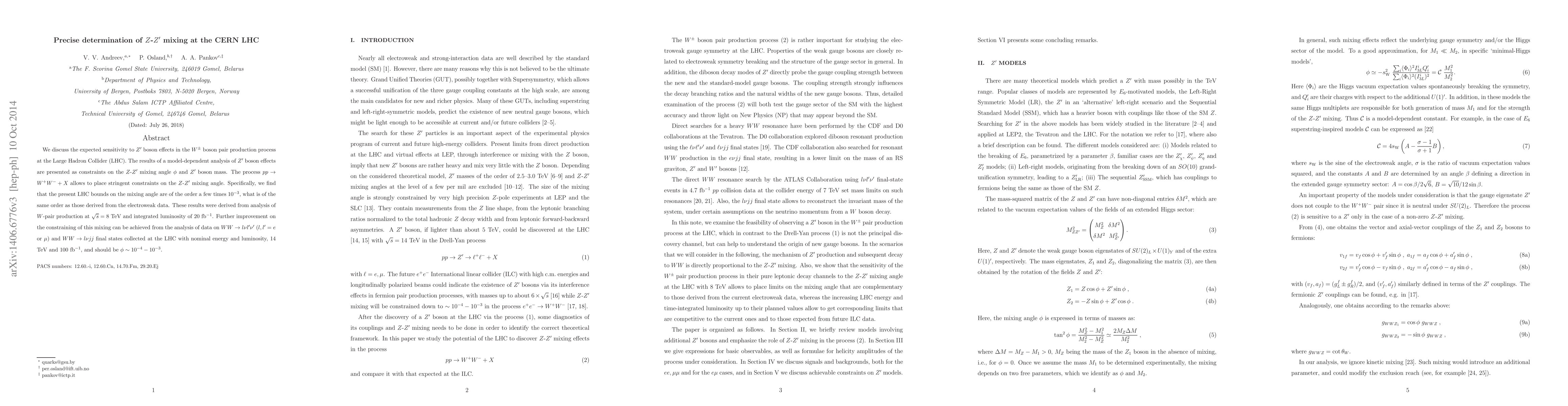We discuss the expected sensitivity to Z' boson effects in the W^\pm boson pair production process at the Large Hadron Collider (LHC). The results of a model-dependent analysis of Z' boson effects are presented as constraints on the Z-Z' mixing angle phi and Z' boson mass. The process pp\to W^+W^- + X allows to place stringent constraints on the Z-Z' mixing angle. Specifically, we find that the present LHC bounds on the mixing angle are of the order a few times 10^{-3}, what is of the same order as those derived from the electroweak data. These results were derived from analysis of W-pair production at sqrt{s}=8 TeV and integrated luminosity of 20 fb^{-1}. Further improvement on the constraining of this mixing can be achieved from the analysis of data on WW \to l nu l'nu' (l,l'=e or mu) and WW \to l nu jj final states collected at the LHC with nominal energy and luminosity, 14 TeV and 100 fb^{-1}, and should be phi \sim 10^{-4}-10^{-3}.