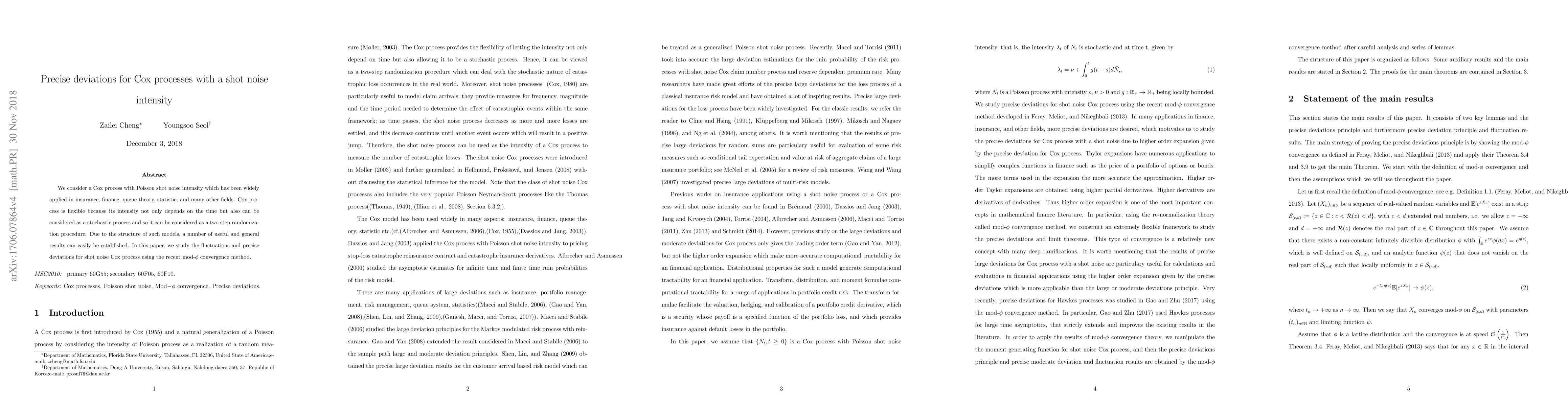 This paper investigates precise deviations for Cox processes with a Poisson shot noise intensity, employing the mod-$\phi$ convergence method to analyze their behavior. The study highlights the flexibility of Cox processes in various fields due to their stochastic intensity dependent on both time and a stochastic process.